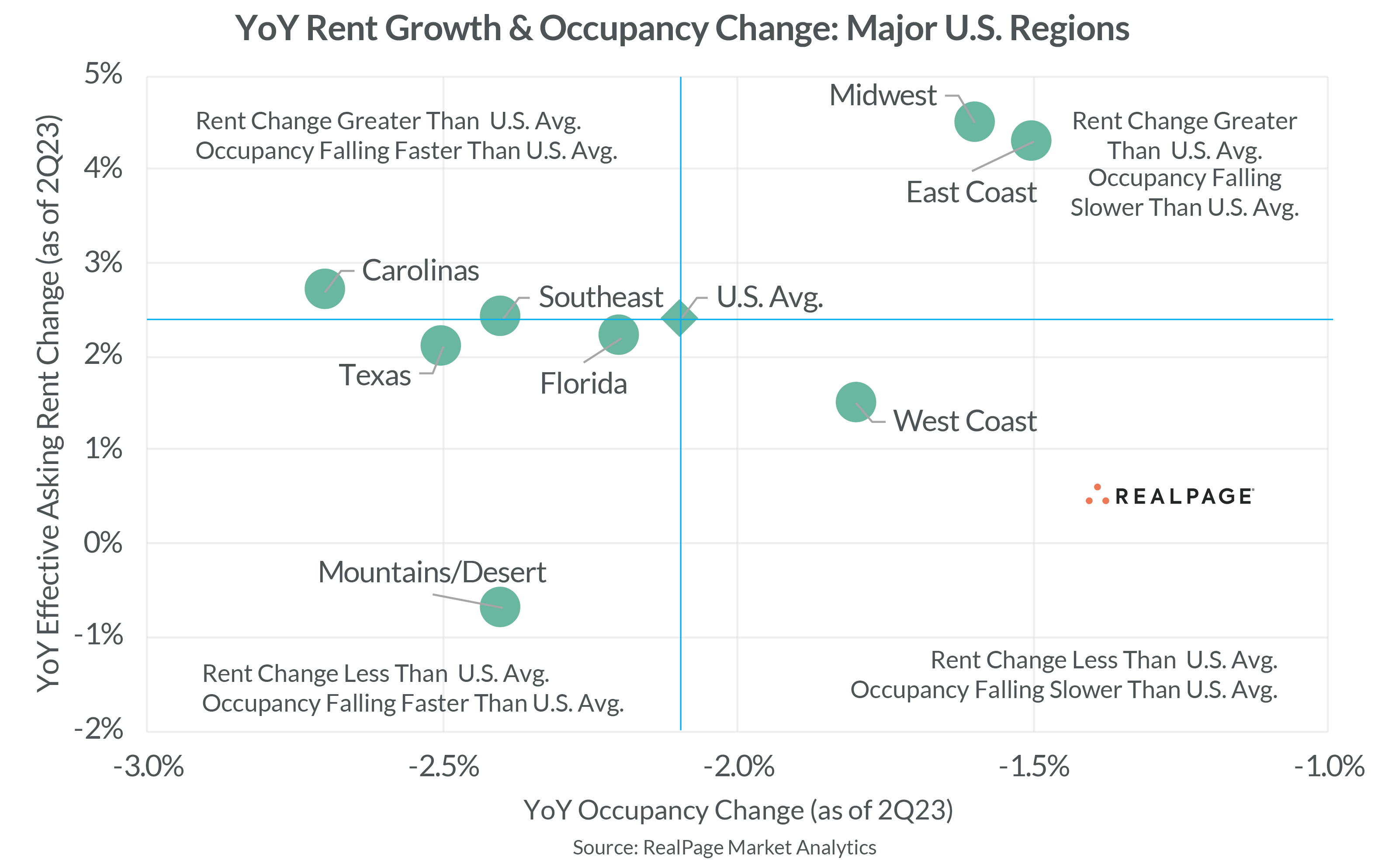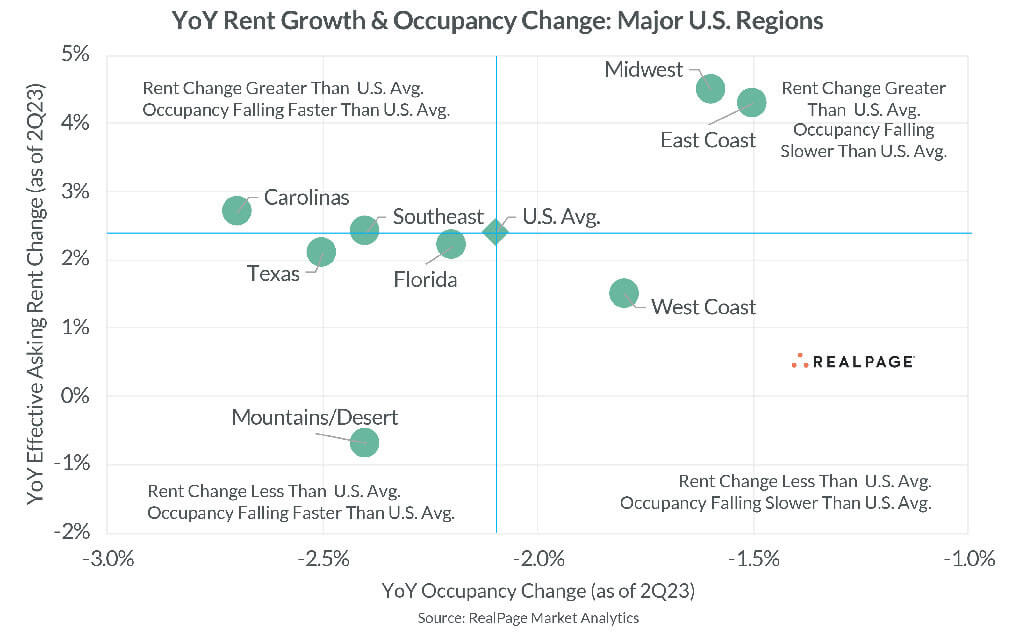 Apartment markets in the Mountains/Desert Region of the U.S. tend to operate in a boom/bust profile, seeing significant growth in good times, and significant declines in bad times. As of 2nd quarter, this region is logging the nation’s deepest performance decline. In the U.S. overall, annual occupancy decline of 210 basis points (bps) and annual rent growth of 2.4% leaves the national performance lackluster. In the Mountains/Desert region, occupancy decline was similar at 240 bps, but that downturn was coupled with rent cuts, which came down by 0.7% year-over-year. While all regions of the country suffered occupancy retrench in the past year, the Mountains/Desert region was the only locale to see rent declines as well. In Texas and the Carolinas, the annual occupancy adjustment was significant, but rent growth in those areas held up the overall performance. On the other hand, the slow-and-steady Midwest as well as the East Coast markets are seeing rent growth accelerate much faster than other regions across the U.S.