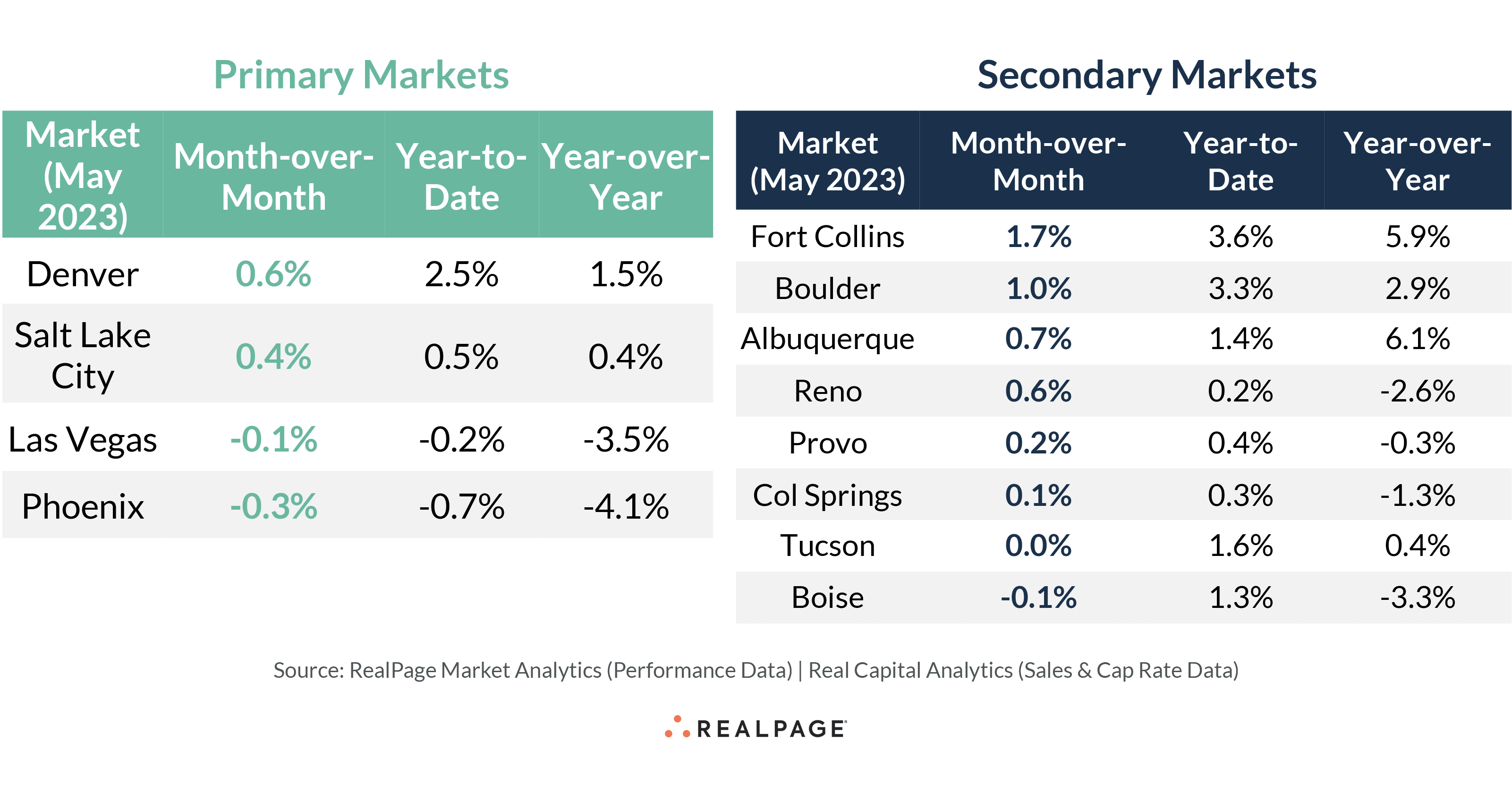 The performance spectrum across the Mountains/Desert region has been vast recently. When looking at rent change on a month-over-month, year-to-date and year-over-year basis, larger markets like Phoenix and Las Vegas stand out with deep year-over-year rent cuts. Prices came down 4.1% in the past year in Phoenix and dropped by 3.5% in Las Vegas. Those were the worst cuts among the nation’s largest 50 apartment markets. Smaller Mountains/Desert region markets Reno and Boise are logging deep cuts as well, with annual declines closer to the 3% mark. In places like Phoenix, Reno and Boise, sizable new supply volumes have compressed market fundamentals to some degree. Meanwhile, Las Vegas hasn’t seen a lot of new inventory, but is grappling with weaker economic growth. On the other hand, some Mountains/Desert region markets logged significant rent growth in the past year. Albuquerque rents registered a gain of 6.1% in the past year, while Fort Collins logged a 5.9% increase. Boulder and Denver recorded respectable growth around 2% to 3% in the past year, but both of these markets have seen notable progress year-to-date in 2023, making up for some losses seen at the end of 2022.