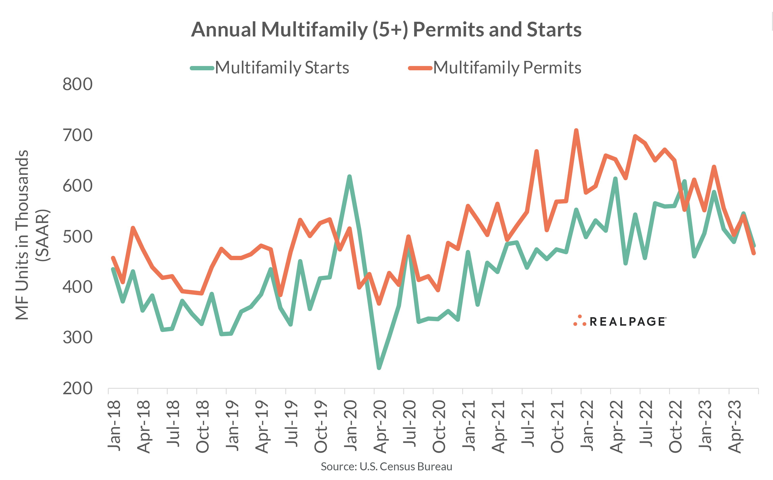 The seasonally adjusted annual rates for both multifamily permitting and starts declined month-over-month and year-over-year as of June. According to the latest release from the U.S. Census Bureau, June’s multifamily permitting rate slowed 13.5% from May to 467,000 units, down 33.1% from last June.