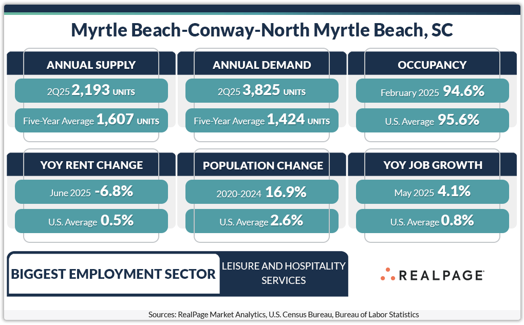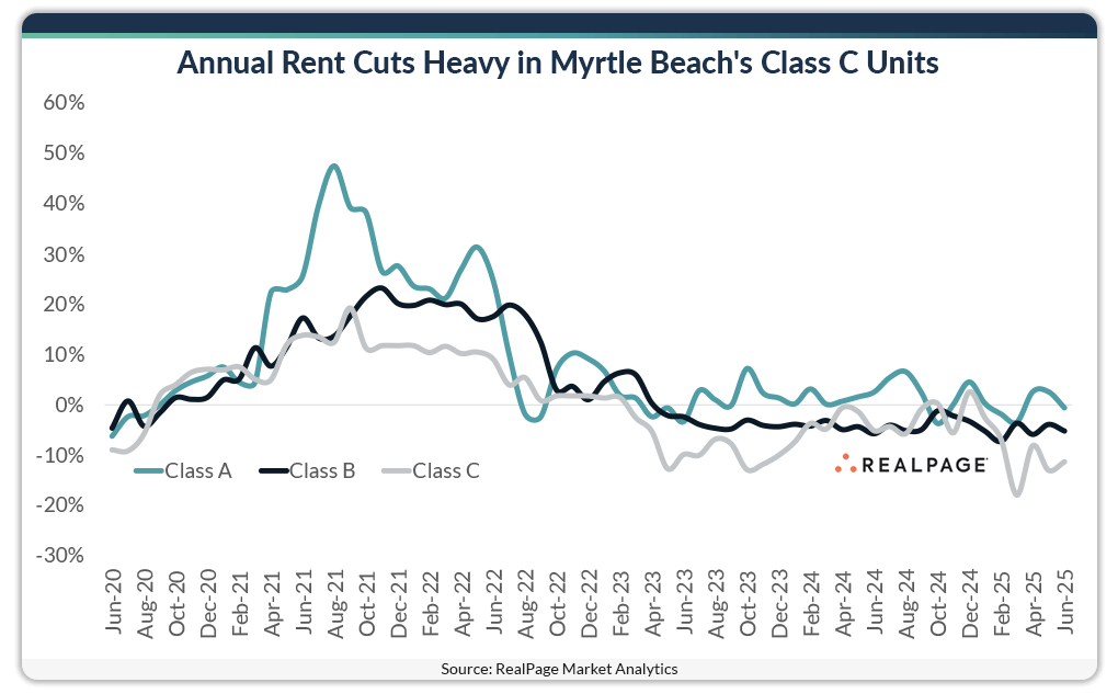 Record apartment demand improved occupancy notably in Myrtle Beach in the past year, but operators continue to cut rents in the face of elevated supply volumes.