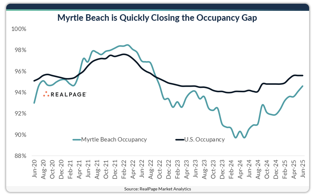 Just one year ago, Myrtle Beach was reacting very differently to elevated supply volumes, displaying one of the nation’s worst occupancy performances, as heavy supply weighed down this small apartment market’s resources. But a quickly growing population and solid demand have boosted occupancy at one of the fastest rates nationwide this year.