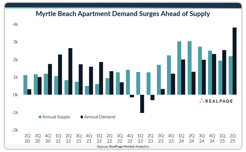 Apartment demand hit an all-time high in Myrtle Beach in the year-ending 2nd quarter, with absorption topping out at 3,825 units, according to data from RealPage Market Analytics. That was more than double the market’s five-year average of over 1,400 units and was nearly five times the decade norm of about 840 units annually.