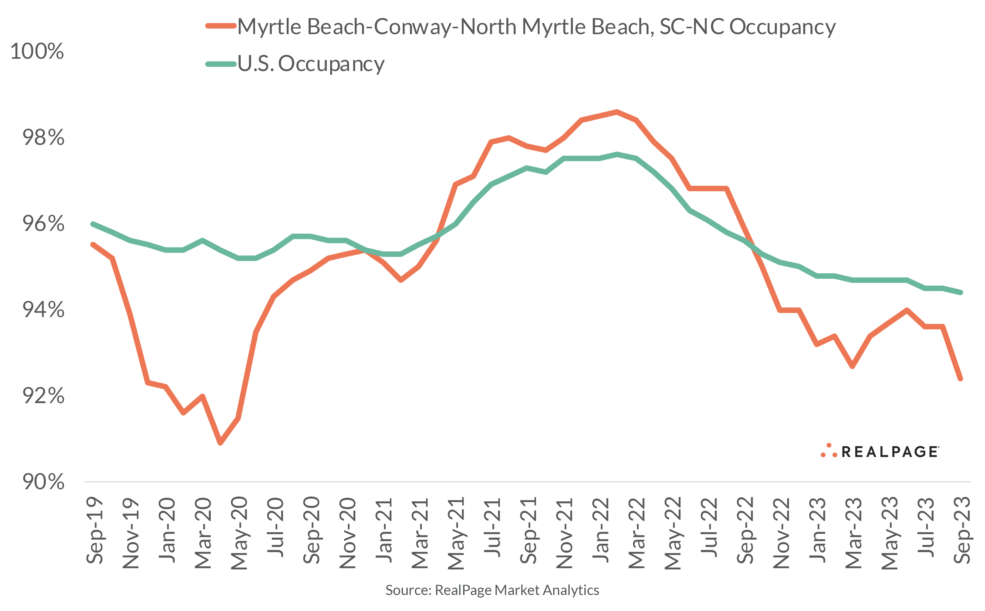 Myrtle Beach suffered the nation’s most significant apartment occupancy loss in the past year. While this apartment market saw notable occupancy growth in 2021 and 2022, when remote workers were flocking to small beach towns along the Florida coastline, the influx of new supply has more recently taken its toll. Most of the largest 150 apartment markets in the U.S. were hit with occupancy decline in the year-ending September, but none suffered quite as much as Myrtle Beach, where the loss was significant at 350 basis points (bps). This decline left the September rate at 92.4%, one of the worst showings nationwide, according to data from RealPage Market Analytics. Putting downward pressure on occupancy in recent months, Myrtle Beach saw one of the nation’s biggest inventory growth rates in the past year. With a small existing stock of just over 47,000 units, this market saw the completion of nearly 2,700 new apartments in the past 12 months, which increased the existing base by a significant 6%. That’s a lot of new product for an apartment base that logged the delivery of only about 7,300 or so units in total in the decade before that. Next year’s completion total is similar, with another 5.6% increase scheduled.