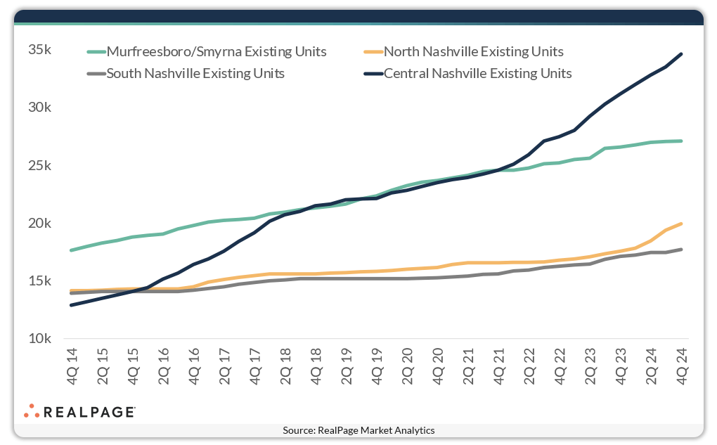 The Central Nashville submarket includes the metro’s downtown area, which has exploded with growth over the past 10 years. The downtown area’s population has almost quadrupled since 2000, to 7,685 people in 2014, according to the Nashville Downtown Partnership.