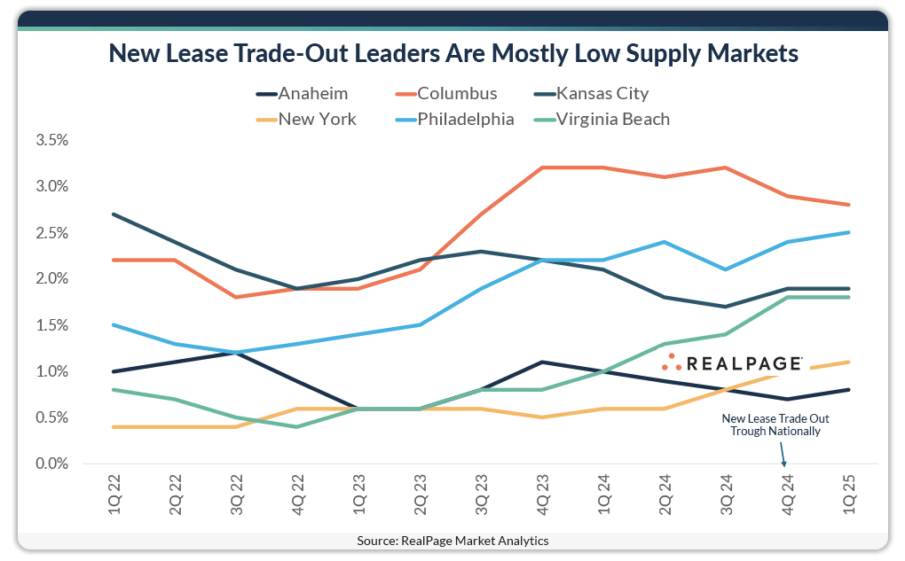 All six of these markets hit their respective low points for new lease trade-out in the final months of 2024 when supply was peaking nationwide. Anaheim is the relative leader among this grouping as new lease trade-out bottomed out at 1.4%. (Austin and Denver, meanwhile, were slashing new leases roughly 10% at that time.) Columbus, Kansas City and New York managed new lease growth between 0.5% and 1% during that time. Philadelphia and Virginia Beach essentially posted no change to new leases in late 2024, which still made those markets national leaders for this metric.