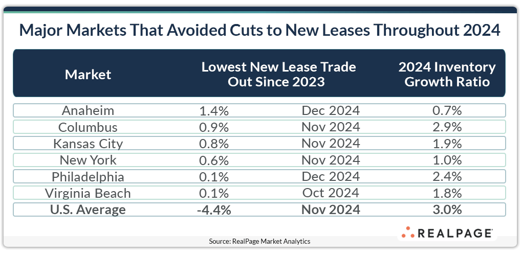 Across a small handful of major markets, however, new lease trade-out never turned negative. Those markets – Anaheim, Columbus, Kansas City, New York, Philadelphia and Virginia Beach – managed modest (and sometimes near-stagnant) growth to new leases while the nation at large was slashing rents.