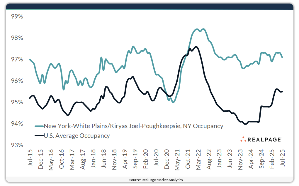 Occupancy is incredibly strong in New York’s conventional apartment stock, boosted by some of the nation’s best absorption volumes. Apartment occupancy in New York was at 97.1% in July, according to data from RealPage Market Analytics. That was one of the best showings among the nation’s 50 largest apartment markets, bested only by the rate in neighboring Newark (97.2%). Occupancy has held relatively steady in New York recently, up only 20 basis points (bps) year-over-year. While the U.S. overall saw quite a bit more occupancy progress in the past year (140 bps), that momentum took the July reading to 95.5%, quite a bit behind the New York showing. New York also ranked among the nation’s leaders for apartment absorption, logging demand for over 32,800 units during the year-ending 2nd quarter 2025. Only Dallas and Atlanta saw more absorption during that period.