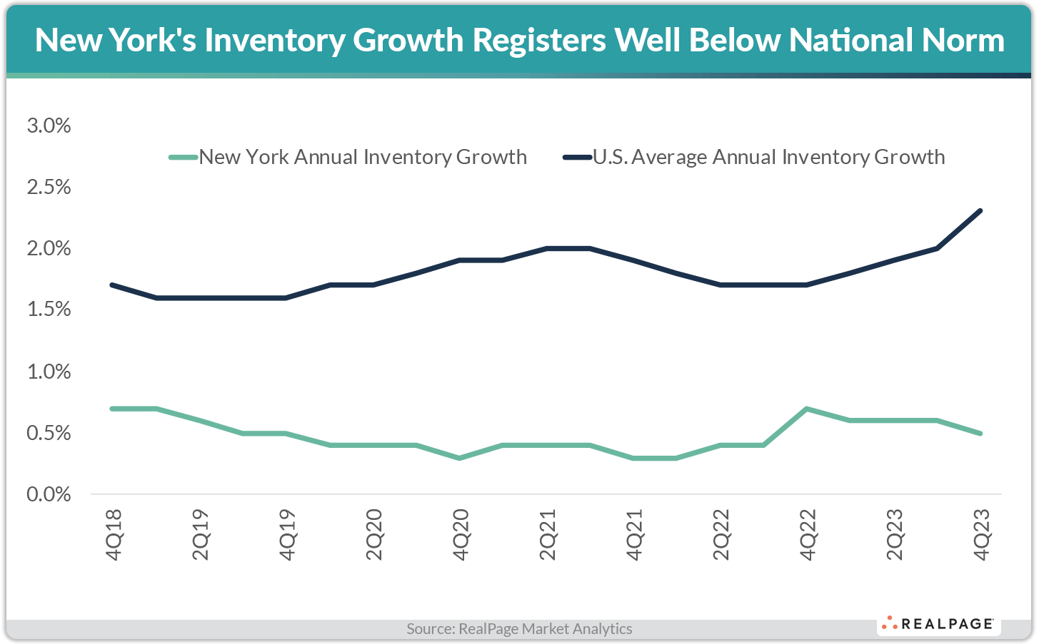 In 2023, New York added 10,543 units for an annual expansion rate of just 0.5%, well below the U.S. average of 2.3%. In the past year, supply in New York was greatest in the Brooklyn (2,904 units) and Bronx (2,120 units) submarkets. At the end of 2023, there were 53,330 units under construction with 24,694 of those units scheduled to complete in 2024. If all those scheduled completions do wrap up in 2024, that would be the highest delivery volume since RealPage began tracking the market in 2008. Scheduled deliveries in the coming year are expected to be concentrated in Brooklyn (8,523 units), Queens (5,277 units) and South Westchester County (4,465 units), with those three submarkets capturing three-fourths of New York’s new supply.