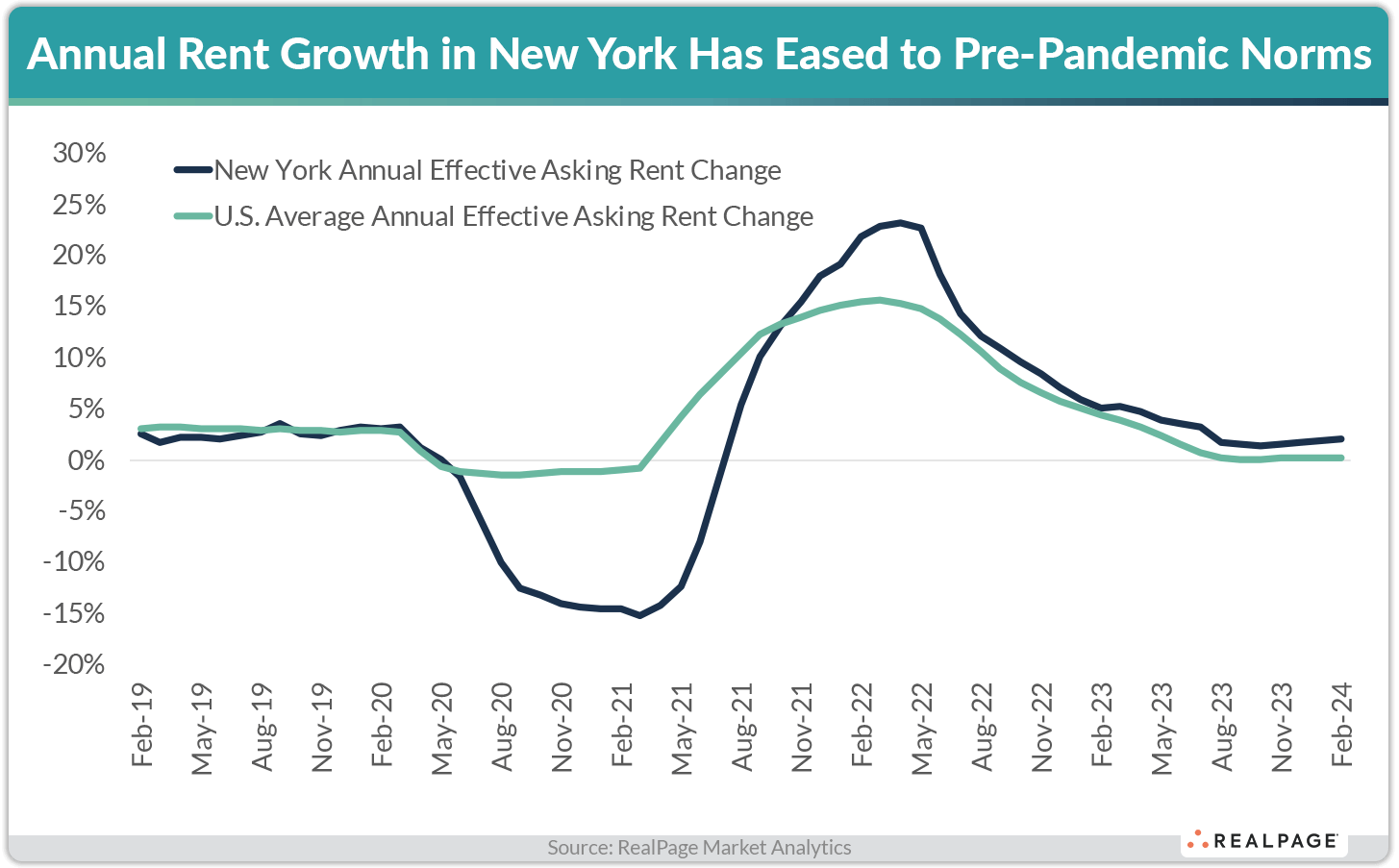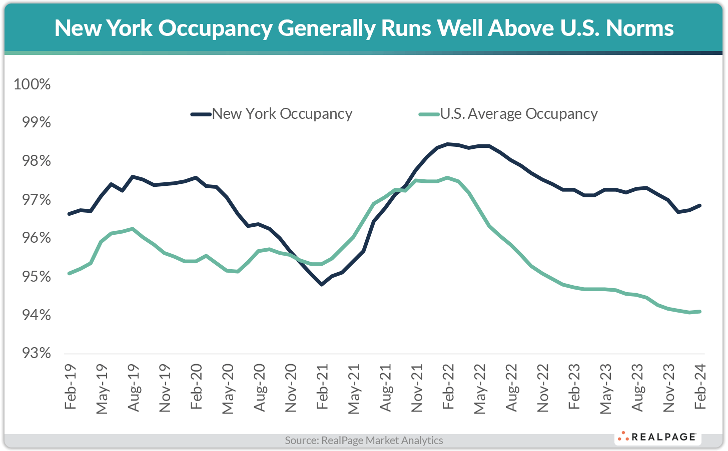 With supply outpacing demand over the past year or so, occupancy has been trending down. After reaching a decade high of 98.5% in February 2022, occupancy has contracted 160 basis points (bps) to register at 96.9% as of February 2024. Despite the backtracking, New York had the tightest February 2024 occupancy rate among the nation’s 50 largest apartment markets and came in 280 bps above the U.S. average. Except for a blip during 2021, occupancy in New York always registers well above national norms.
