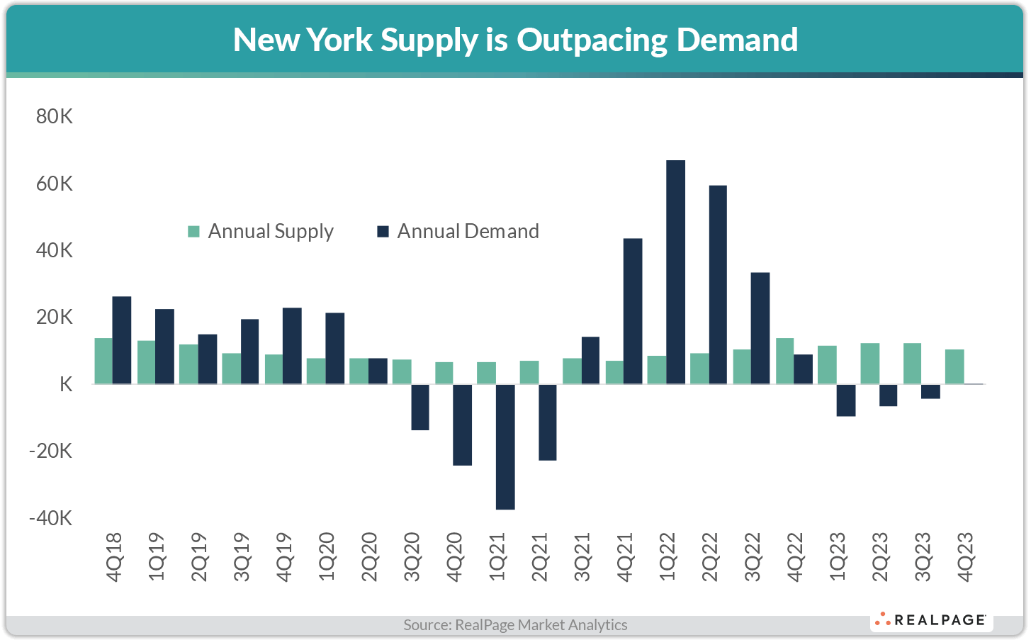 Supply in New York is currently outpacing demand, as the market recorded absorption of just 183 units in 2023. However, over the past five years, demand has exceeded new supply (51,242 units to 46,682 units). In fact, among the nation’s 50 largest apartment markets only New York and Chicago have seen five-year demand exceed five-year supply, with New York far outperforming Chicago by a wide margin. Among New York submarkets, the strongest absorption over the past five years was seen in Brooklyn (18,257 units), Queens (13,404 units) and the Bronx (9,459 units). Those areas accounted for 80% of the market’s total demand over the past five years. In the past year, demand was greatest in the Bronx (18,795 units) and to a much lesser degree the Brooklyn (2,140 units) and South Westchester County (1,918 units) submarkets.