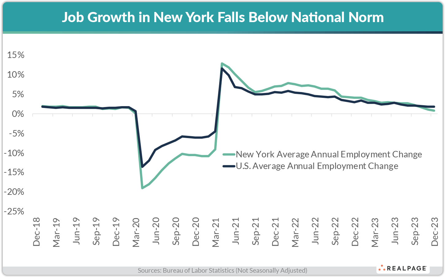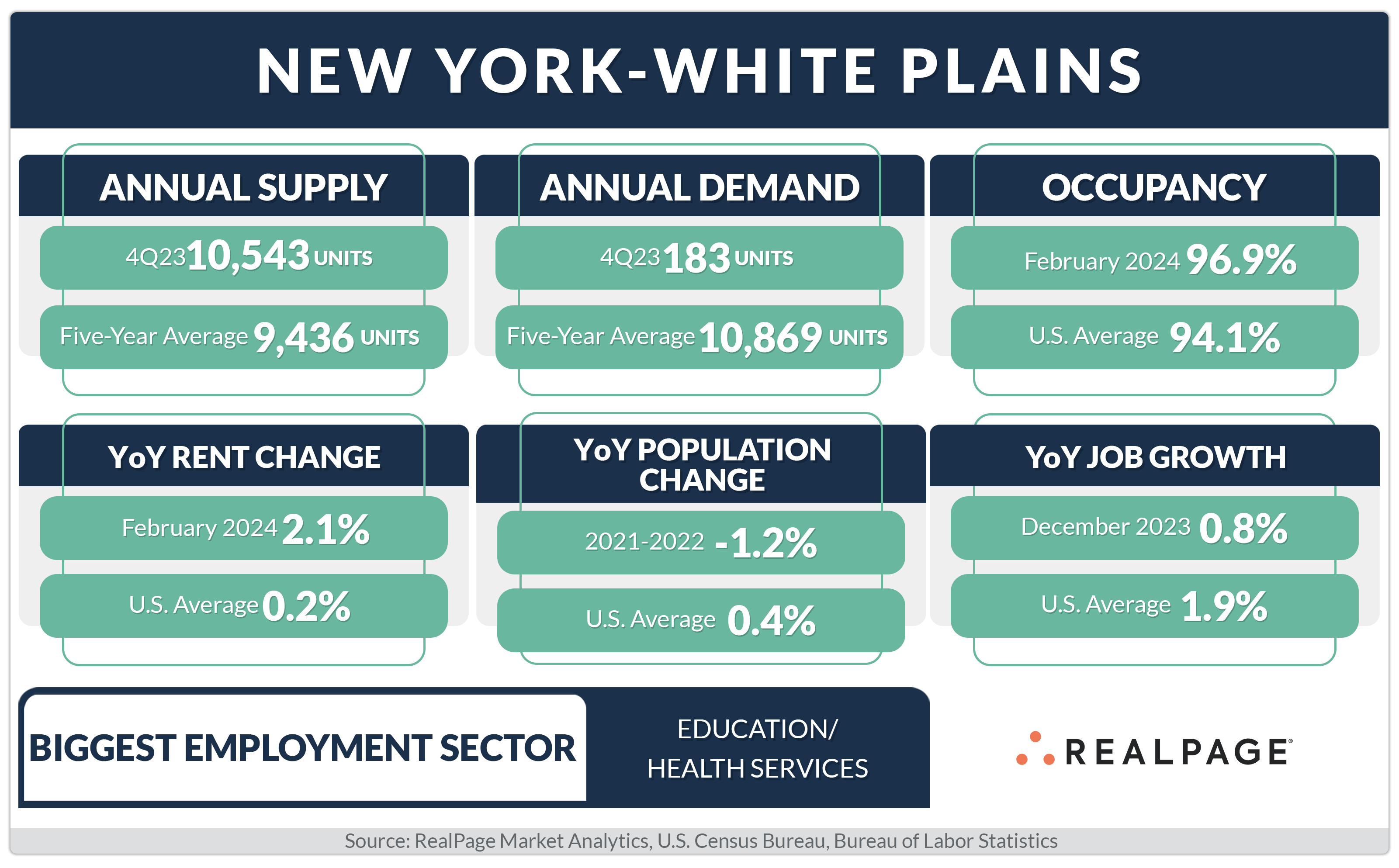 New York was hit hard not only by COVID-19 pandemic-era job cuts, but also by residents fleeing the city for less expensive rental options when employees started working from home. Some just went across the Hudson River, while others moved all across the nation as the work-from-anywhere trend took hold. However, New York has recovered all the jobs lost during the pandemic, with its current employment base now sitting roughly 179,000 jobs, or 2.5%, above the pre-pandemic level from February 2020. Most recently, the metro recorded a net gain of 61,300 jobs in 2023, about a 1% year-over-year increase. While the number of jobs added over the past year ranked seventh nationally, it was less than half of New York’s annual average job gain prior to the pandemic (2015-2019). During the past year, job gains in New York-White Plains were most pronounced in the Education/Health Services sector.