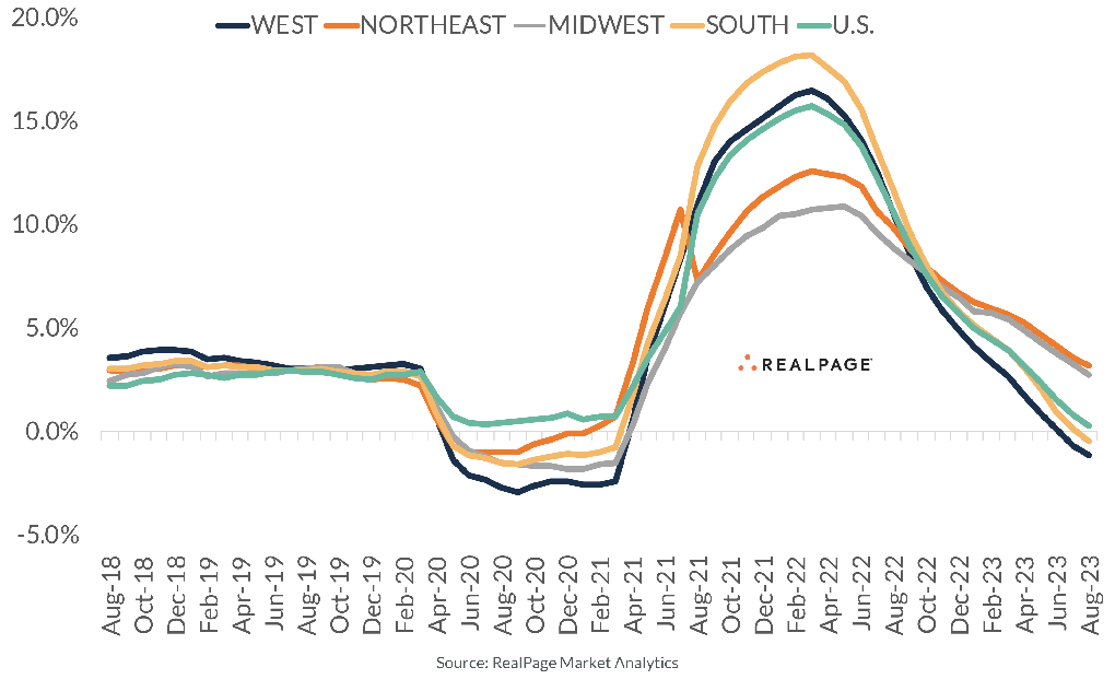 As apartment rent performance across the nation trends down, rent growth in the Northeast and Midwest is outperforming. The Northeast leads the U.S. with operators pushing effective asking rents 3.2% on average in the year-ending August 2023, according to RealPage Market Analytics. Following close behind, rents in the Midwest were up 2.7% in the 12-month period. While both of these performances were well above the U.S. average (0.3%), rates are still below five-year norms, which were inflated by double-digit performances in much of 2021 and 2022. While pricing power has been lost everywhere, however, the Northeast and Midwest performances remain positive, as operators in the South and West turn to rent cuts. Historically, rent growth in the Northeast and Midwest has hit at or below U.S. norms. Over the last five years, rent growth averaged 4.8% in the Northeast and 4.1% in the Midwest, both behind the U.S. norm (5.1%). These are obviously very different regions, in demographics, population and monthly rental rates. With expensive markets like New York, Boston and Newark, the five-year average for rents in the Northeast ($1,847) outpaced the U.S. norm of $1,555 by nearly $300. Conversely, rents in the Midwest ($1,176) ran about $400 below the national norm. As of August 2023, that performance story continued with Northeast rents ($2,210) above the nation’s norm ($1,824) and Midwest rents ($1,395) below the U.S. average.