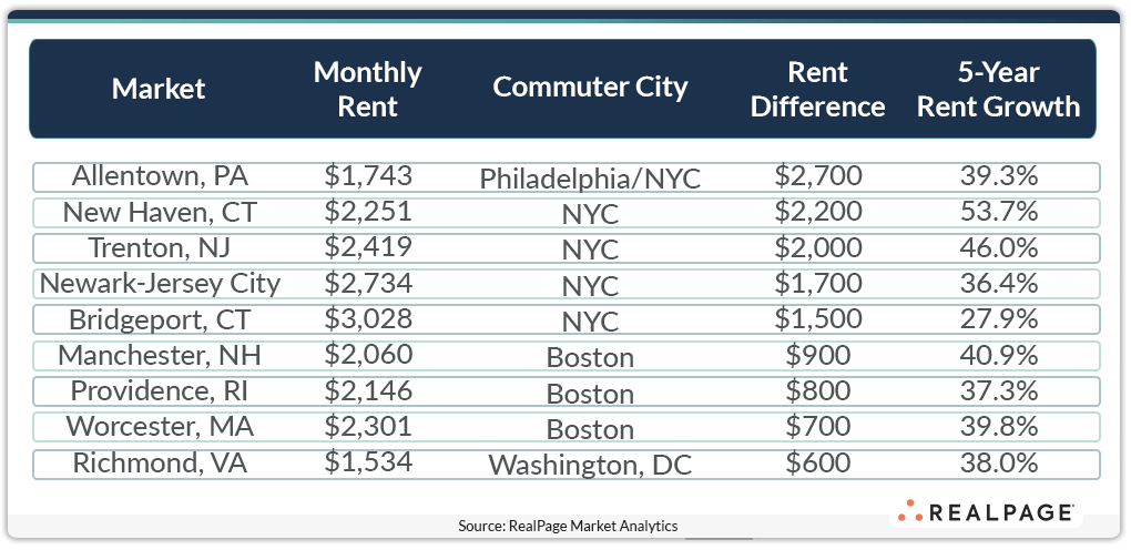 Small commuter towns became popular during the COVID-19 pandemic, when employees started working from home. Five years later, these more affordable locales remain prevalent. Operators have been pushing rental rates in these commuter markets in light of strong demand and occupancy readings, but prices still remain behind larger markets nearby. For example, effective asking rents in January were at $1,743 in Allentown, PA, a small commuter market roughly an hour and a half drive to Philadelphia or two hours to New York. Workers willing to live in this smaller town and commute to the bigger cities pay about $100 less than the average rent in Philadelphia and a whopping $2,700 less per month than they would if they lived in New York. Two small towns that have become commutable to New York in the wake of more flexible work-from-home and hybrid policies are New Haven, CT and Trenton, NJ, where rents are roughly $2,000 less than prices in New York. As a result, operators have pushed rental rates above average, as prices in these two locales have grown by about half since 2020. In comparison, effective asking rents in the U.S. overall have grown about 27% on average during that period.