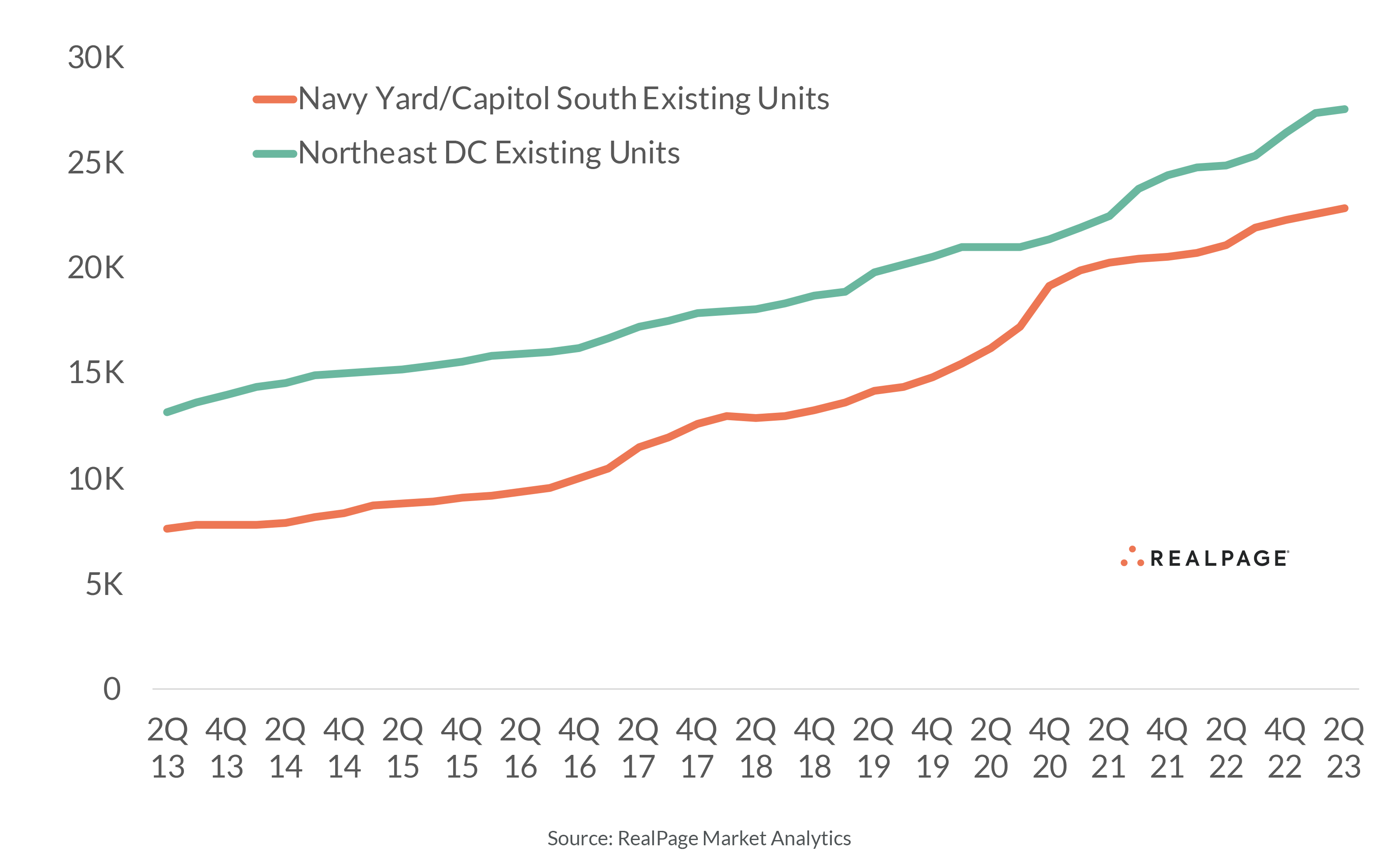 Washington, DC has not been one of the fastest growing markets in the nation over the past decade, but two of its 36 submarkets have seen prolific growth. Overall, DC added roughly 122,000 units to inventory in the past 10 years, growing its existing unit count 22%, according to data from RealPage Market Analytics. That growth rate ranked #44 among the nation’s core 150 markets. But two submarkets saw much more impressive growth. Of the 996 submarkets comprising the nation’s core 150 markets, just 24 have doubled in size over the past 10 years, and two of those were in Washington, DC. Of those 24 high growth submarkets, only seven were in urban cores. Both DC submarkets that have doubled in size over the past decade were in the urban core. Navy Yard/Capitol South was the second fastest growing submarket in the nation, behind Dallas’ Frisco area. In fact, Navy Yard/Capitol South nearly tripled its unit count in the past 10 years, growing from 7,644 units in 2nd quarter 2013 to 22,806 units in 2nd quarter 2023, a growth rate of 198%. Meanwhile, the Northeast DC submarket ranked #17, growing 110% with the addition of 14,449 units over the past decade, taking existing stock to 27,568 units. Both those urban core submarkets are expected to continue expanding at accelerated rates. In the year-ending 2nd quarter 2024, Northeast DC’s existing inventory is scheduled to grow 8.4%, while Navy Yard/Capitol South is expected to expand 7%. Both growth rates are well above Washington, DC’s expected average pace of 2.9% in the coming year.