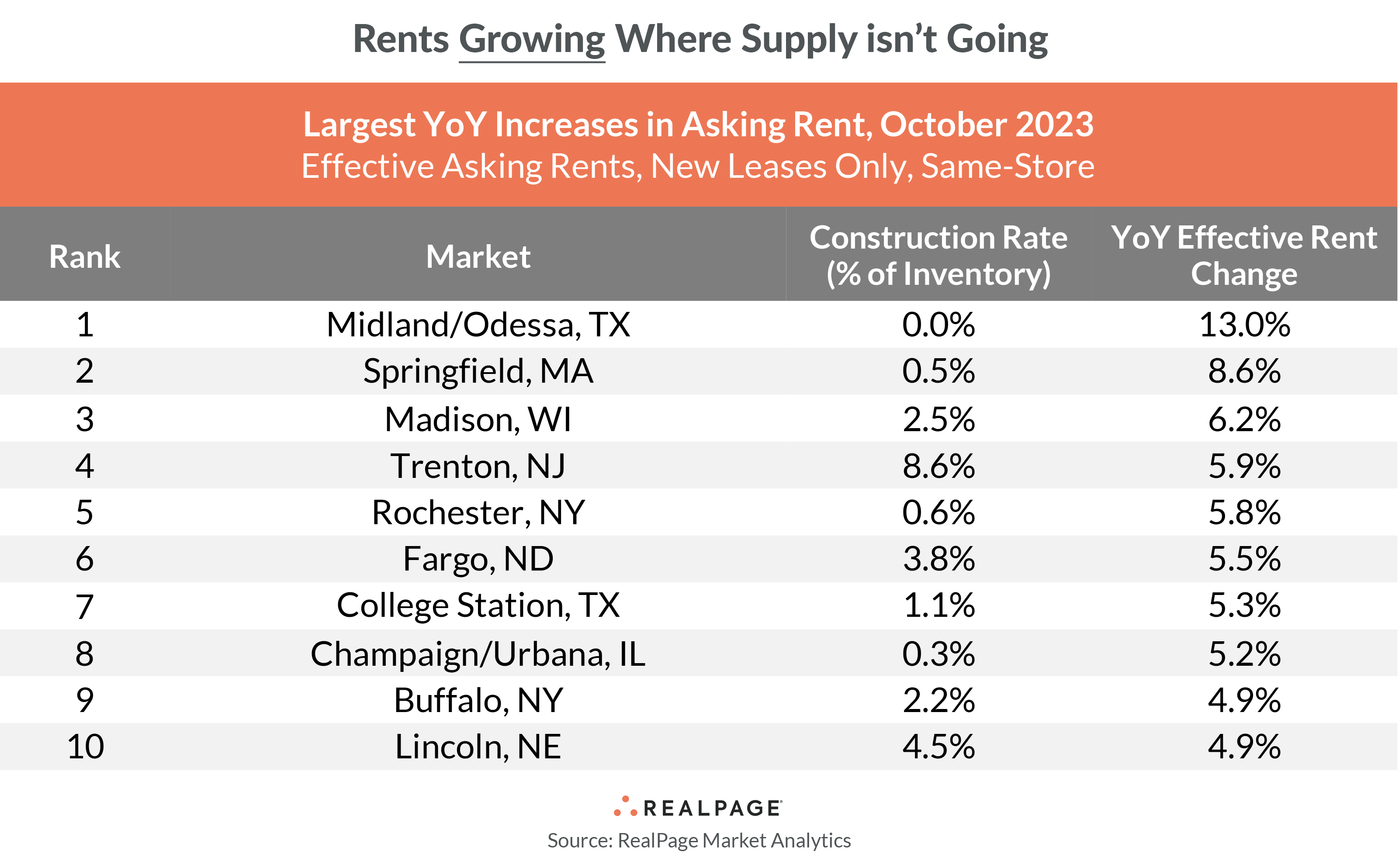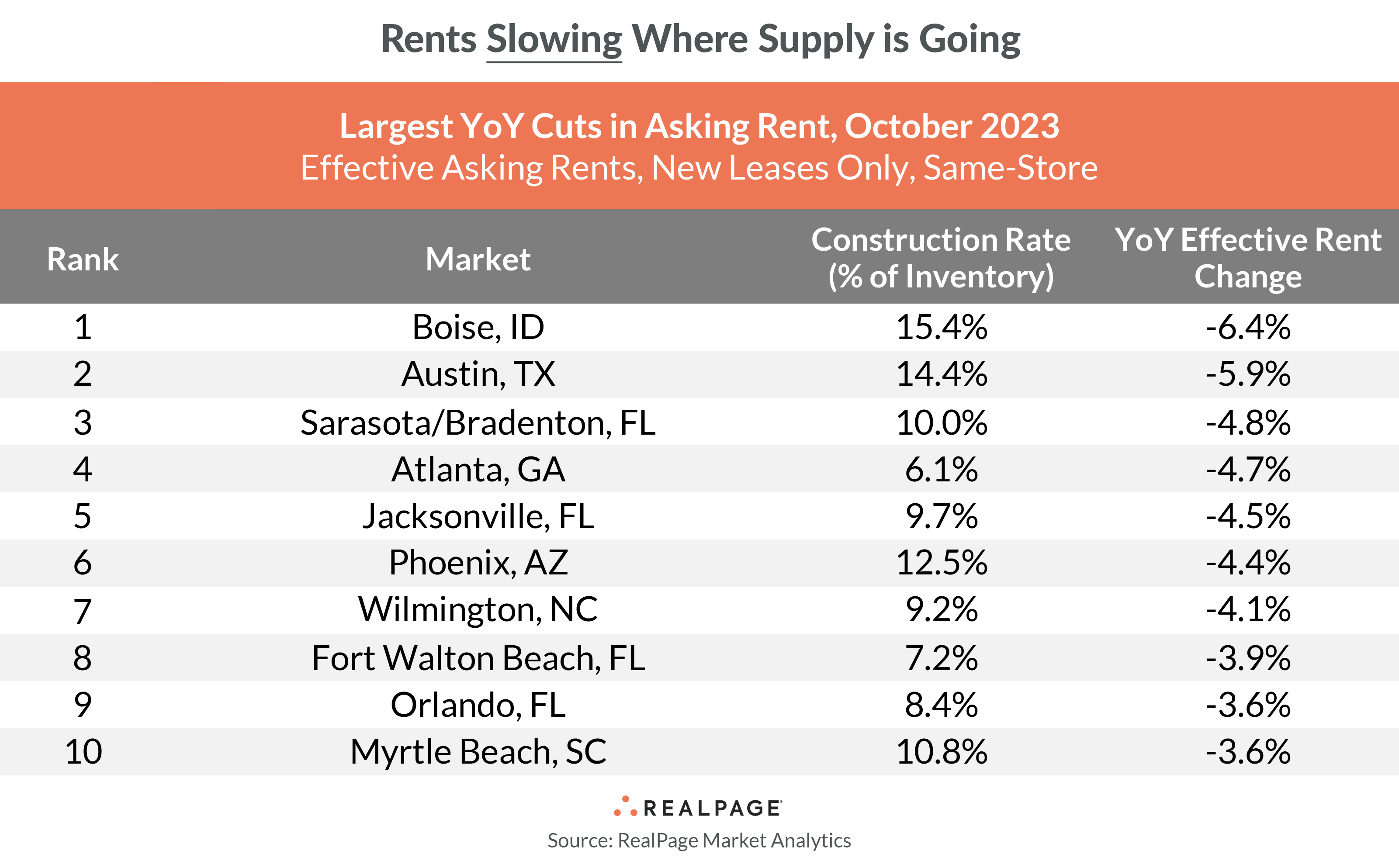 And among markets cutting rents the most, nearly all are adding new supply at above-average rates.