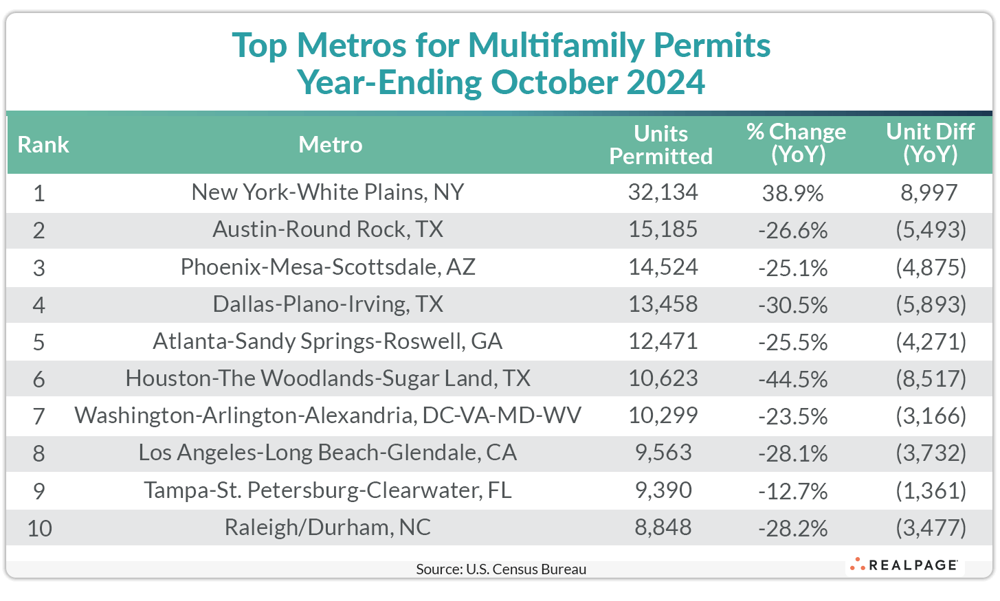 New York continued to lead the nation for multifamily permitting in the 12-months-ending in October with 32,134 units permitted. New York was also the only top 10 market to increase their annual permitting from the year before. Austin and Phoenix again followed New York with close to 15,000 units permitted but each were down more than 25% from last October, reflecting the national trend of declining multifamily permitting.
