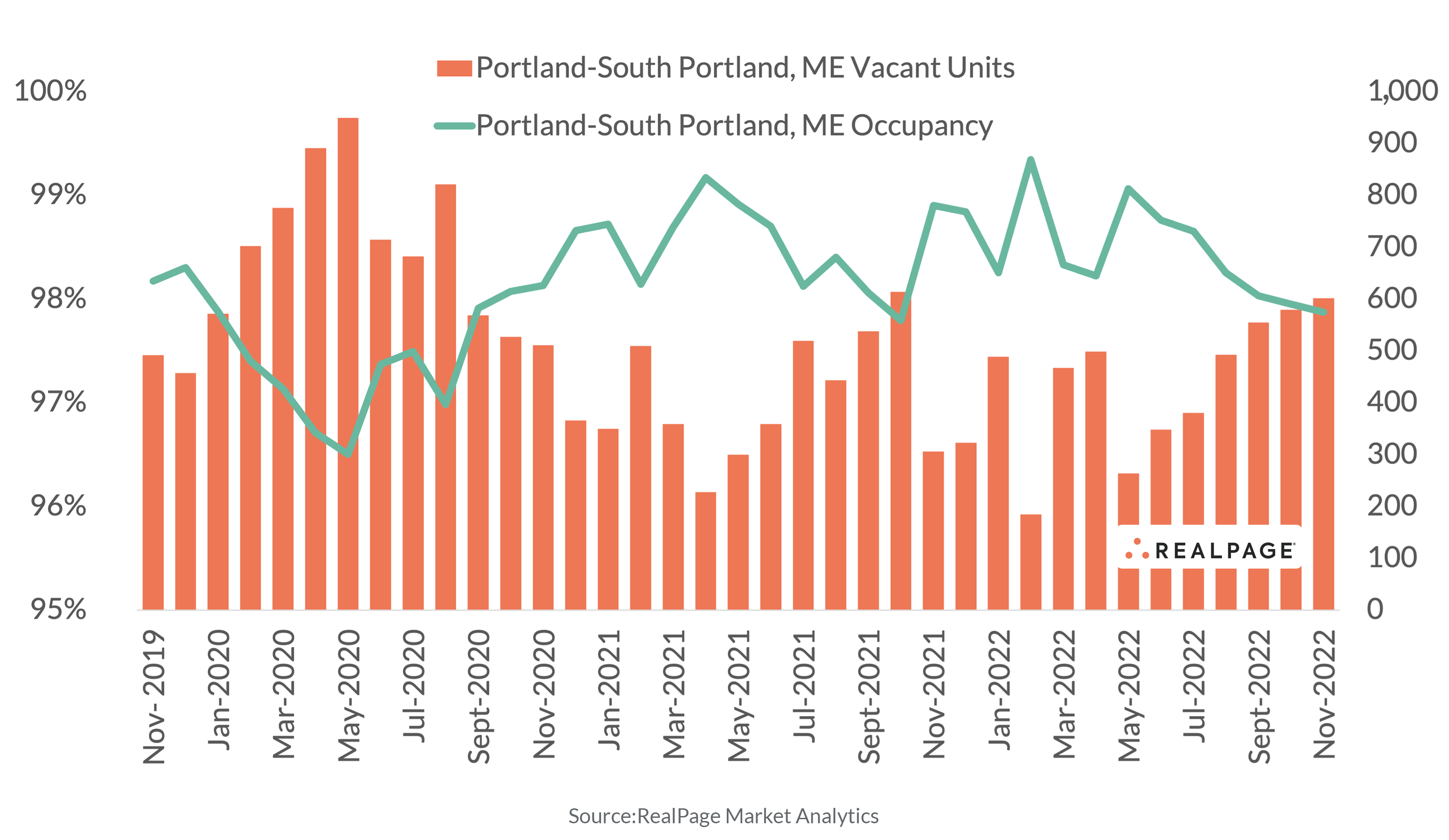 Portland has shared in some serious demographic tailwinds in the last few years. No, not that Portland, OR. We’re talking about Portland, ME. According to the most recent population estimates from the U.S. Census Bureau, the Portland-South Portland market had a 2021 population of about 548,000. Meanwhile, just 28,200 apartment units exist, translating to one apartment unit for every 19 residents. Apartment occupancy in Portland runs very tight, averaging 97.6% over the last five years, according to data from RealPage Market Analytics. As of November, occupancy here stood at 97.9% after falling from recent high of 99.1% in May 2022. As of November, Portland’s tight occupancy translated to just 600 vacant units across the entire market.