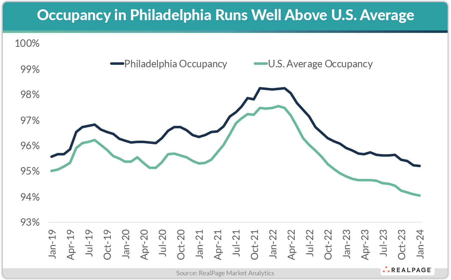 Philadelphia’s apartment market has historically been one of the nation’s most consistent performers, maintaining relatively solid fundamentals even during tumultuous times. Like most apartment markets across the country, Philadelphia experienced deflating market fundamentals after a surge in occupancy and rents in 2021 and 2022. However, the Philadelphia apartment market has been exceeding U.S. norms for both occupancy and rent growth recently, even as elevated supply levels dampen the market’s performance.