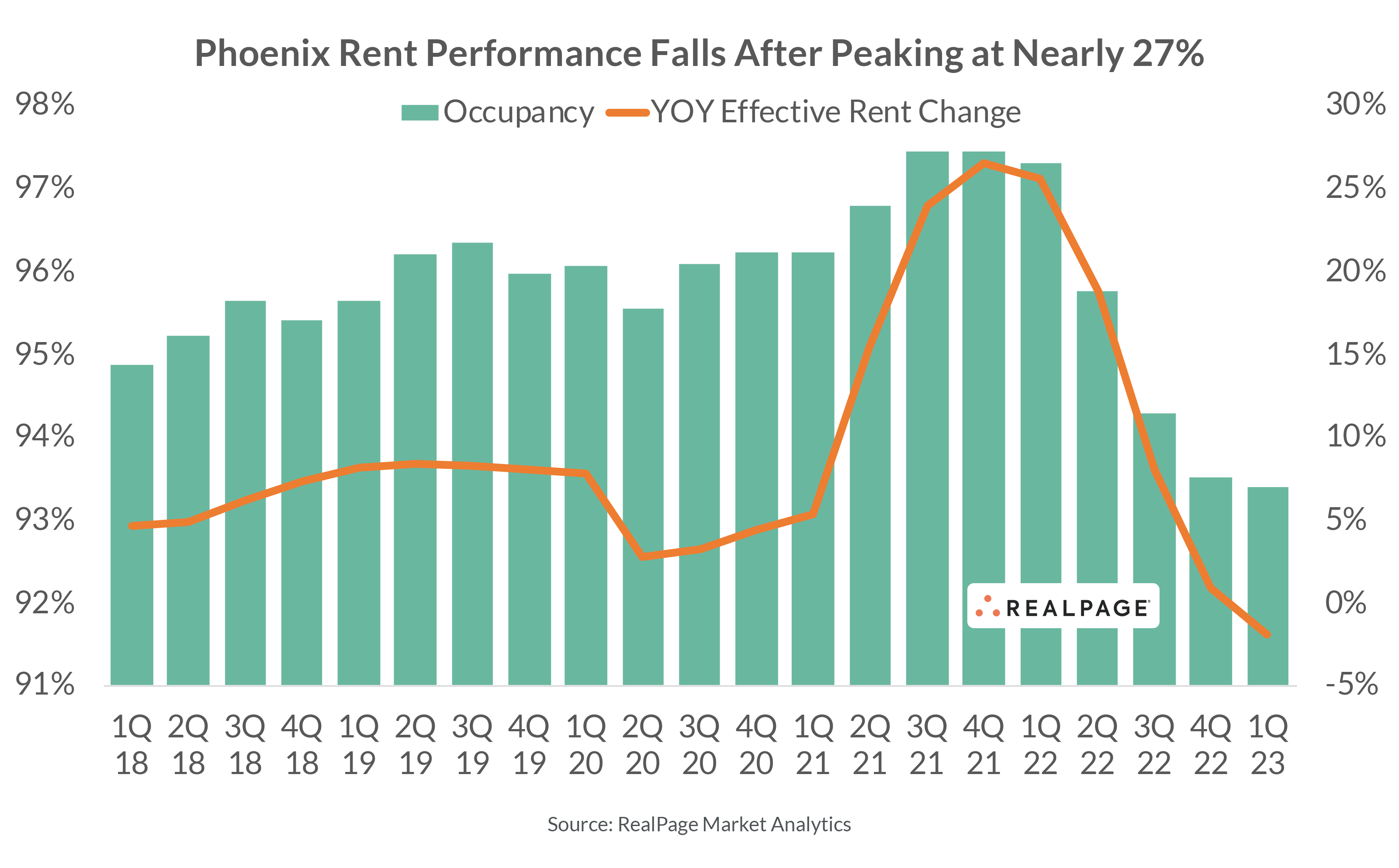 All this new supply in recent years has challenged occupancy. In 1st quarter 2023, Phoenix occupancy backtracked to 93.4%. That rate significantly underperformed in relation to both the U.S. norm and South region average at 94.8% and 94%, respectively. In the coming year, occupancy is expected to remain around 94%.