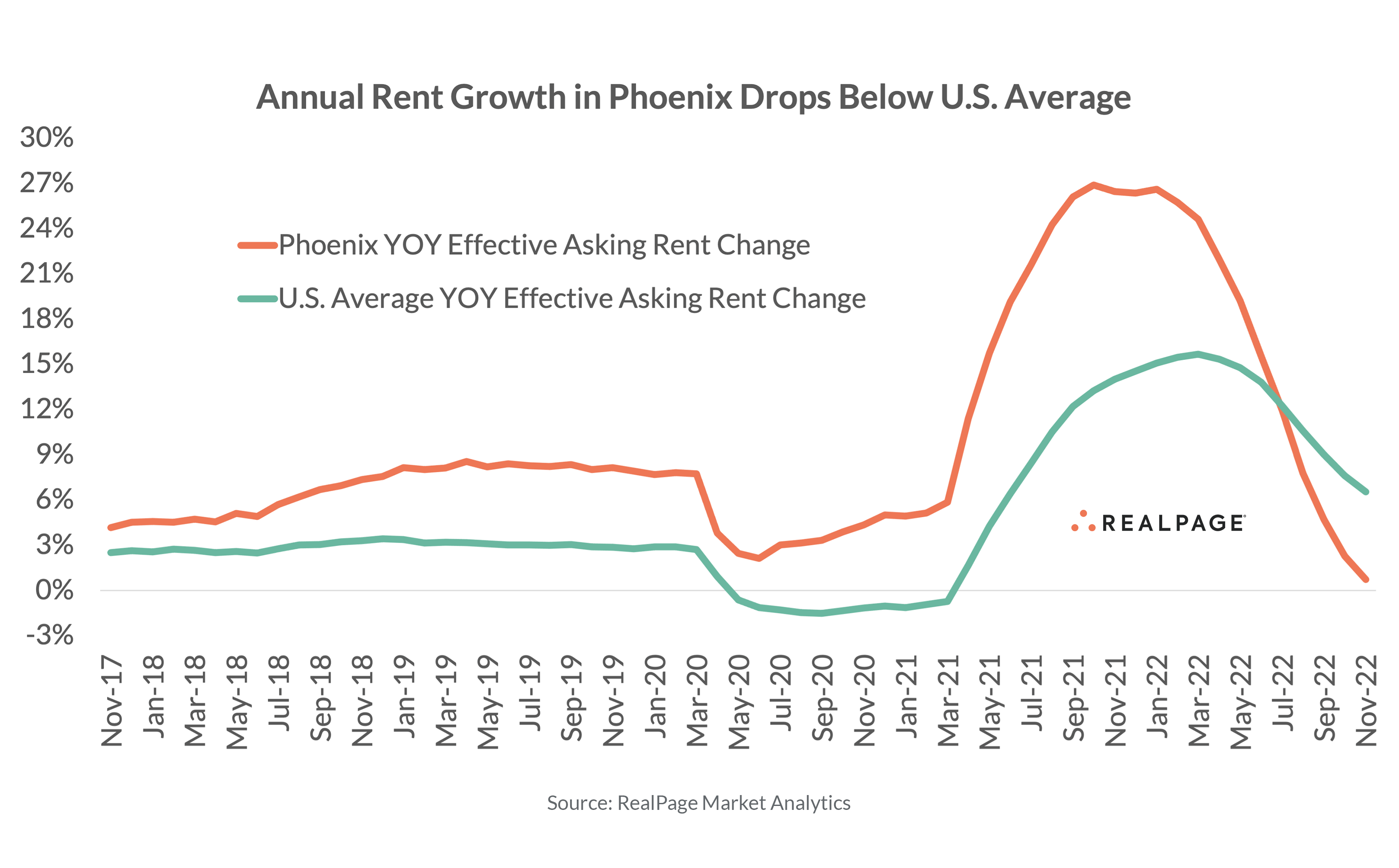 From 2015 to 2019, annual rent growth in Phoenix topped U.S. norms by an average of 290 basis points (bps), according to data from RealPage Market Analytics. And from May 2021 to February 2022, that gap widened to more than 1,000 bps. It was quite a change then, to see rent growth slow down so significantly in the rest of the year. In November 2022, annual rent growth in Phoenix slipped to just 0.7%, well below the national average and second-to-last among the nation’s top 50 markets, only ahead of Las Vegas (0.6%). The last time annual rent growth in Phoenix slipped below the 1% mark, it was 2012.