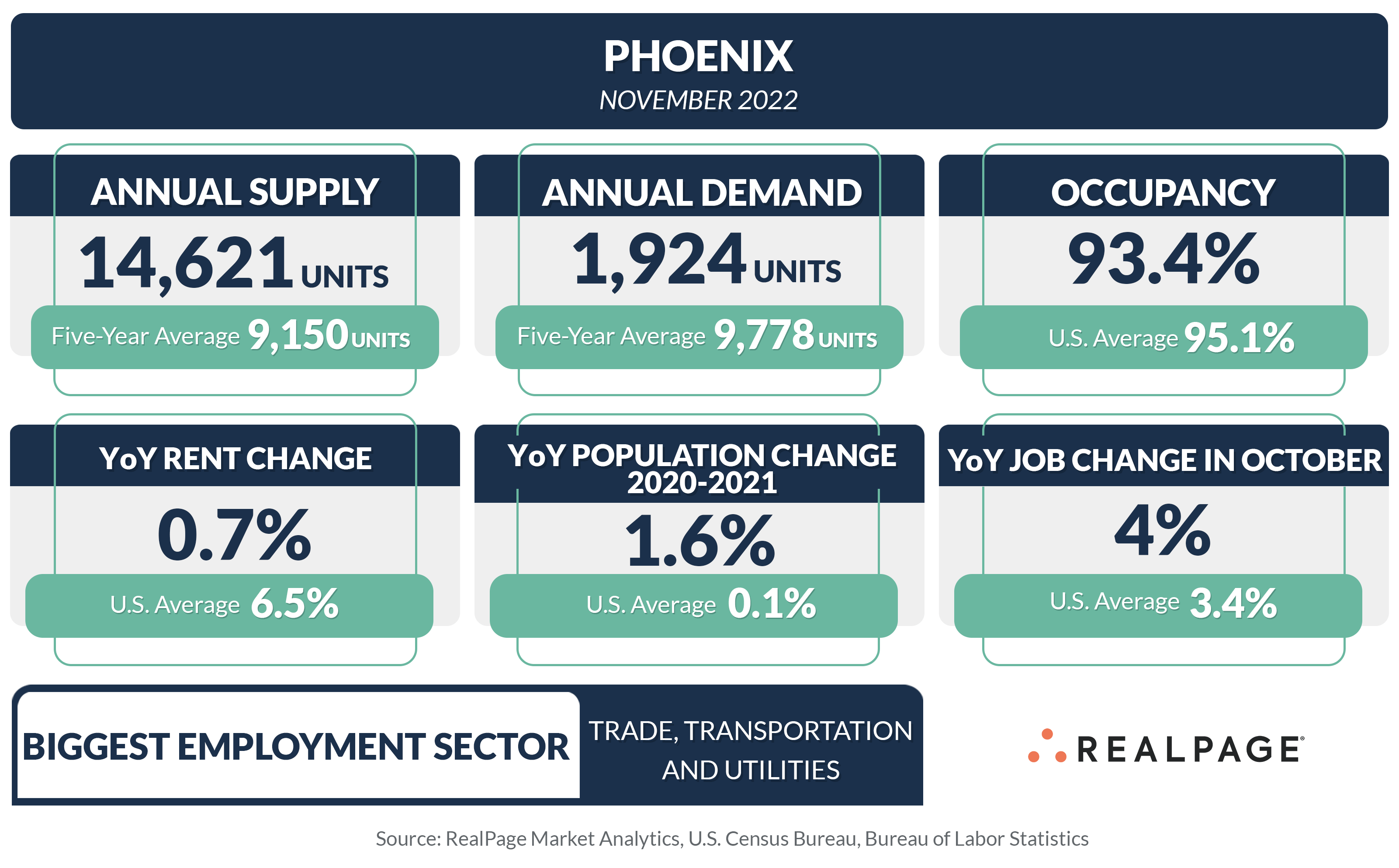 Rent change in Phoenix varied by product class. In the year-ending November, Class A product saw rent growth above the market average, at 2.3%. Meanwhile, Class B units posted a 0.6% increase, while operators in C units cut rents 0.7% year-over-year in November. All of Phoenix’s 23 submarkets recorded rent change at a much slower pace than a year ago. The weakest annual performance in November was seen in North Glendale where rents were cut 5.9%. West Phoenix continued to lead the market with a year-over-year rent increase of 13.7%, marking the 18th consecutive month of double-digit annual rate hikes in that submarket.