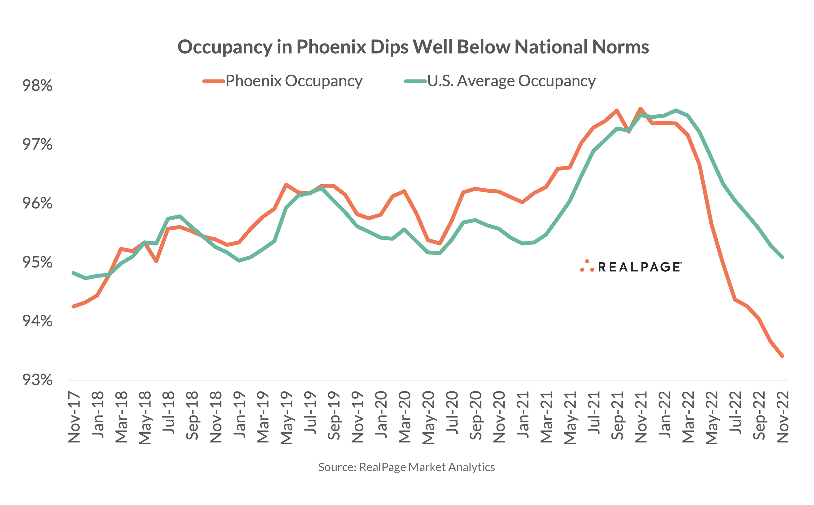 From 2015 to 2019, annual rent growth in Phoenix topped U.S. norms by an average of 290 basis points (bps), according to data from RealPage Market Analytics. And from May 2021 to February 2022, that gap widened to more than 1,000 bps. It was quite a change then, to see rent growth slow down so significantly in the rest of the year. In November 2022, annual rent growth in Phoenix slipped to just 0.7%, well below the national average and second-to-last among the nation’s top 50 markets, only ahead of Las Vegas (0.6%). The last time annual rent growth in Phoenix slipped below the 1% mark, it was 2012.