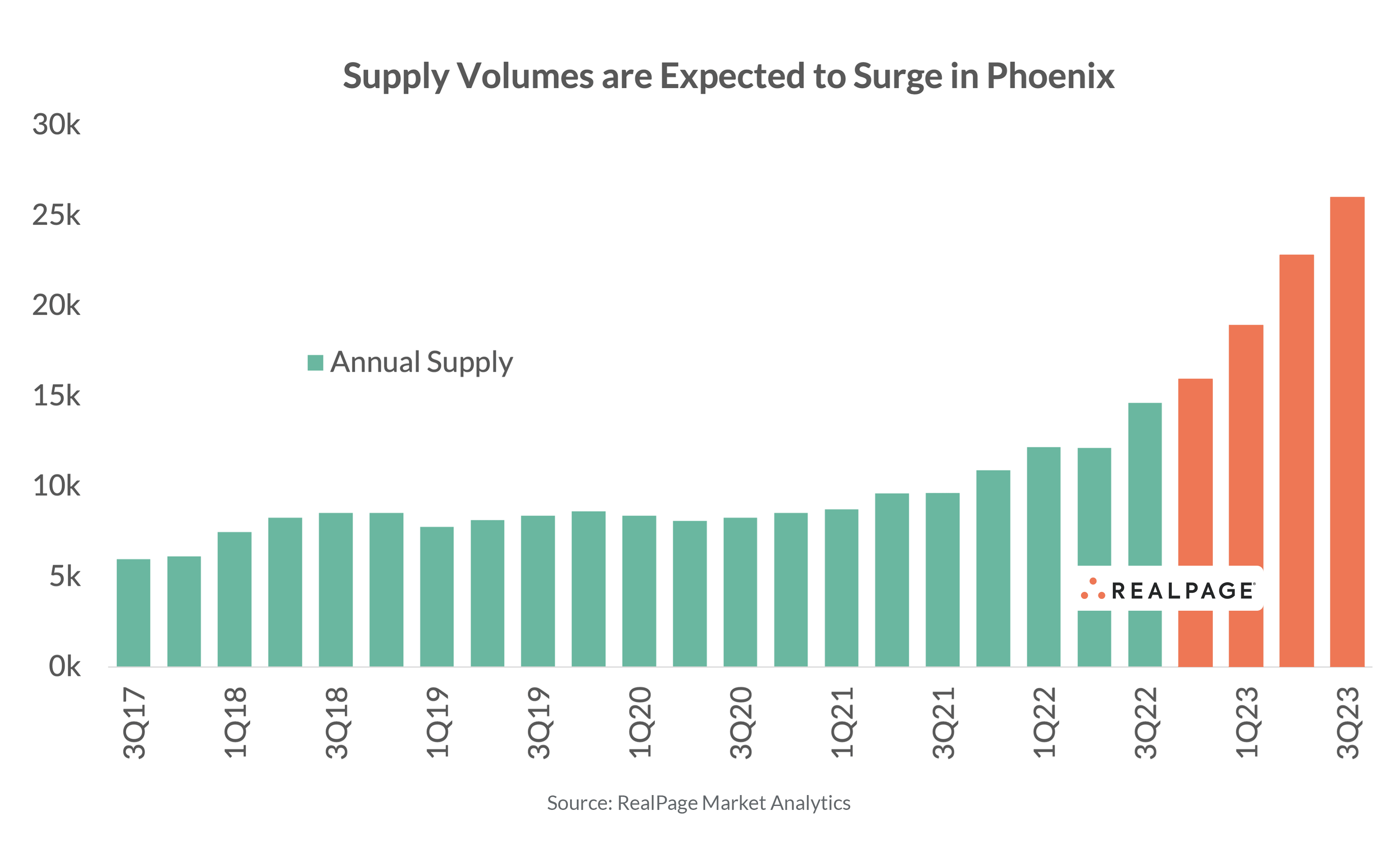 Occupancy and rent growth have been severely impacted by elevated supply. Multifamily permit volumes in this market started to soar in 2020. More than 14,600 units came online in Phoenix during the year-ending 3rd quarter 2022, the nation’s fourth-largest delivery volume. Completions in Phoenix are expected to ramp up even further over the coming year, as apartment deliveries will be at an all-time high, with roughly 26,000 units scheduled for delivery, the highest volume nationally.
