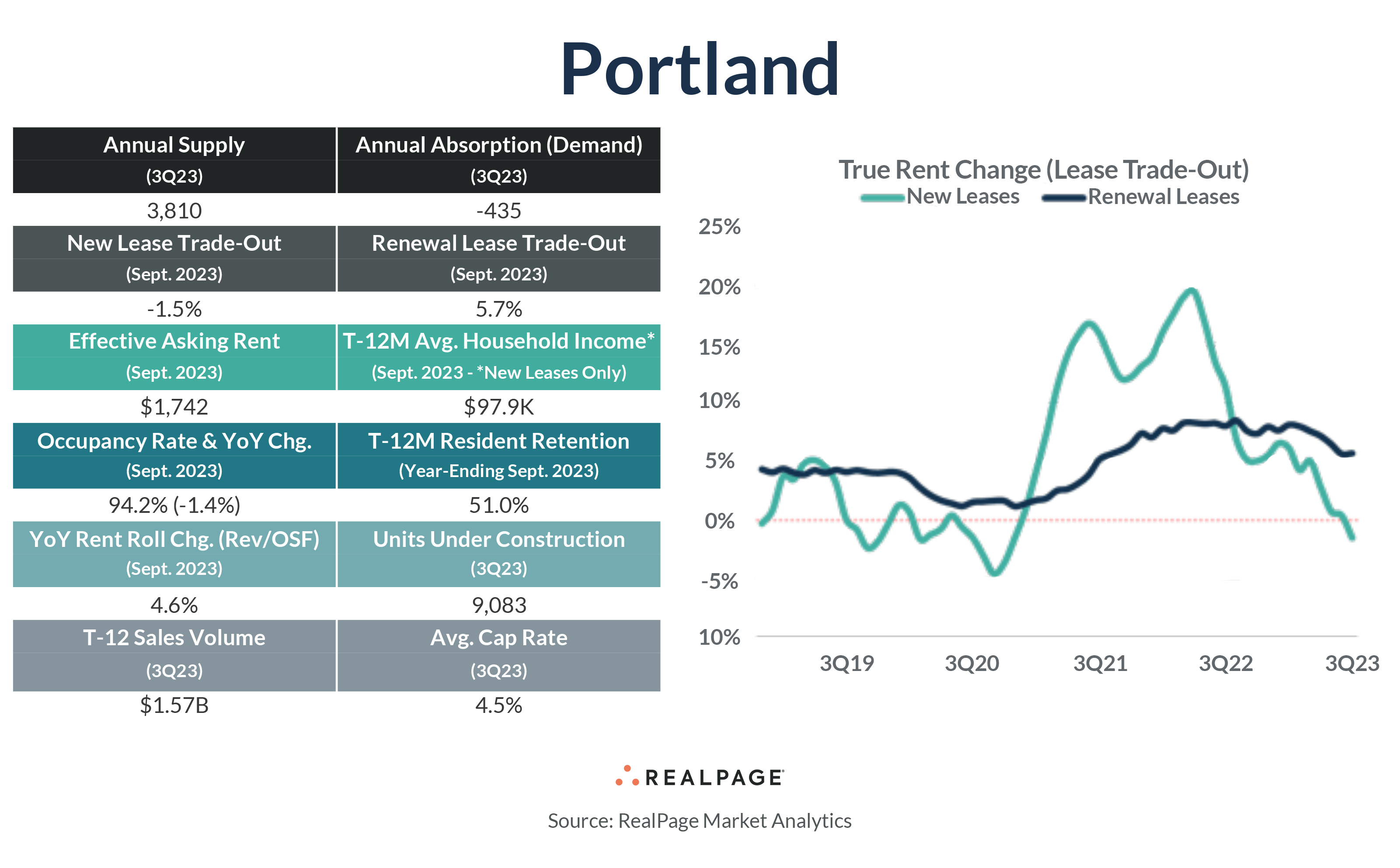 Portland's apartment market has historically been more stable than some other West Coast metros, but recent data shows a decline in fundamentals in 2023. Portland recorded net move-outs from 435 units in the year-ending 3rd quarter, while over 3,800 new units were concurrently delivered. This imbalance resulted in occupancy falling 140 basis points (bps) in the past year to 94.2%, one of the poorest showings in the Pacific Time Zone. As of September, new residents paid 1.5% less than the previous tenant for the same unit in Portland. That was down significantly from just a year ago, in 2022, when new renters were paying trade-out price increases of nearly 20%. Across Portland’s 11 submarkets, none posted rent growth in the last year, though two submarkets – Central Portland and Southwest Portland/Tigard – managed stagnant growth in the year-ending 3rd quarter. In the near term, the Portland apartment market is expected to see increased supply volumes, which may further impact the occupancy and rent change landscape. About 5,500 units are expected to come online in Portland in the next 12 months.