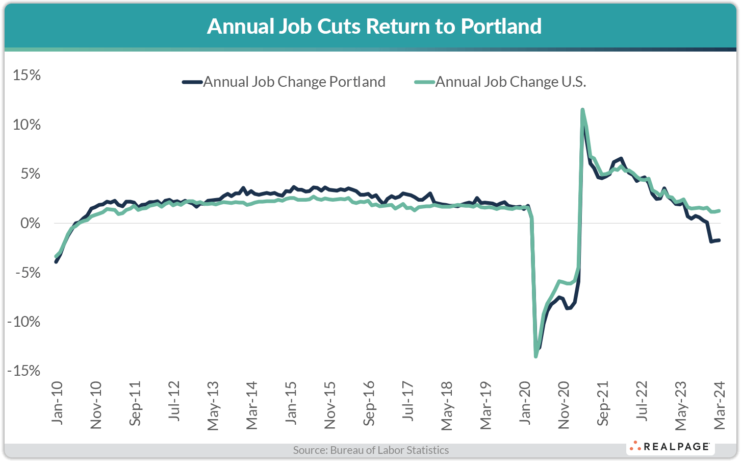 Like most markets nationwide, Portland saw a deep drop in employment formation during the pandemic, but this market recovered quickly, adding jobs a peak pace near 9% in the year-ending April 2021. Still, this was below the concurrent national average of 11.5%. And since that peak, job formation in Portland has been dropping off until January 2024, when employment cuts became the norm. In the latest data from the Bureau of Labor Statistics, Portland’s job market contracted by 1.8% in the year-ending March. That was the worst showing among major markets nationwide.