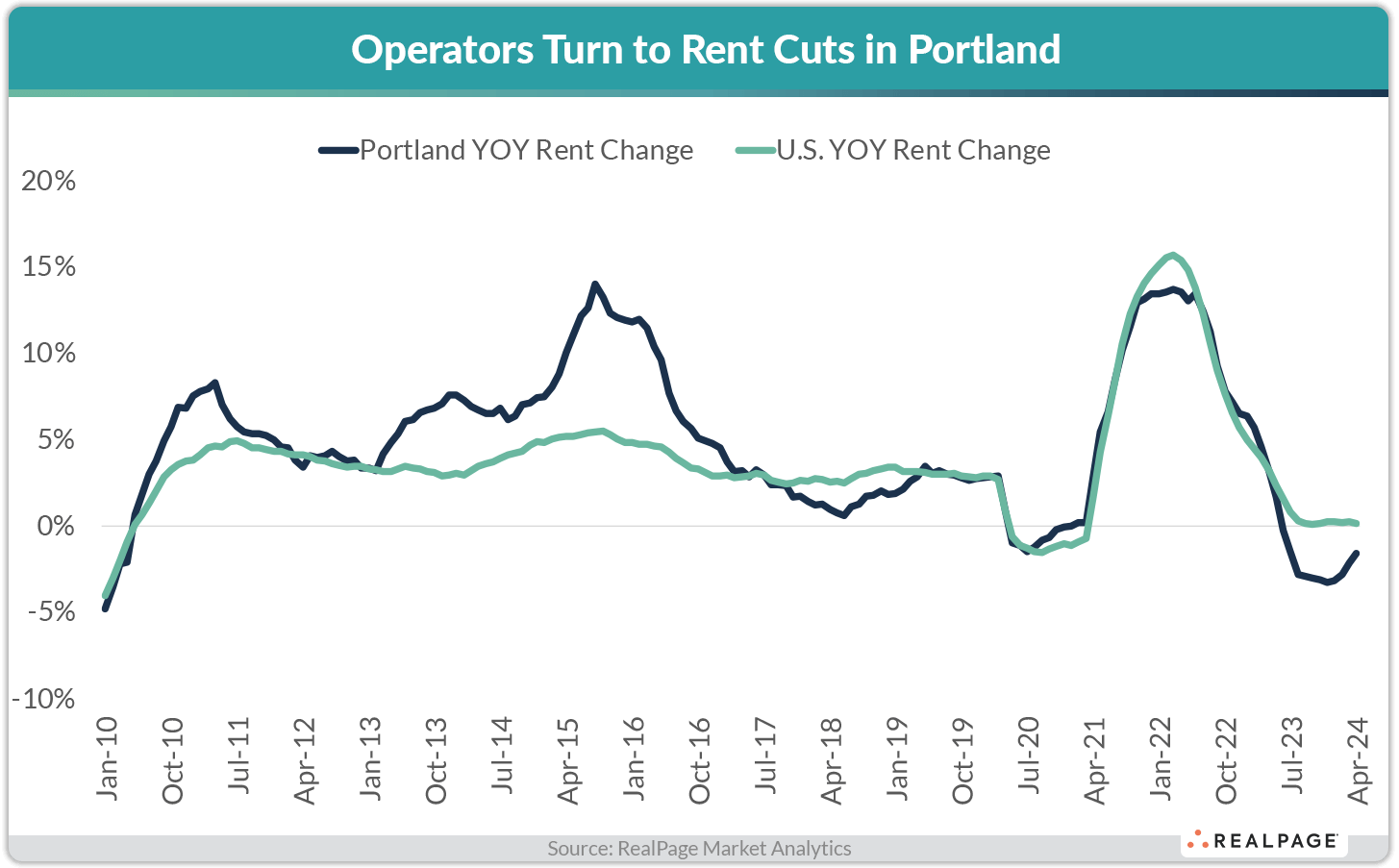 Portland’s apartment market used to comfortably exceed U.S. averages for occupancy and rent growth. Lately, however, performance fundamentals have changed. It’s been almost 15 years since apartment occupancy in Portland was this low, and operators have recently turned to rent cuts.
