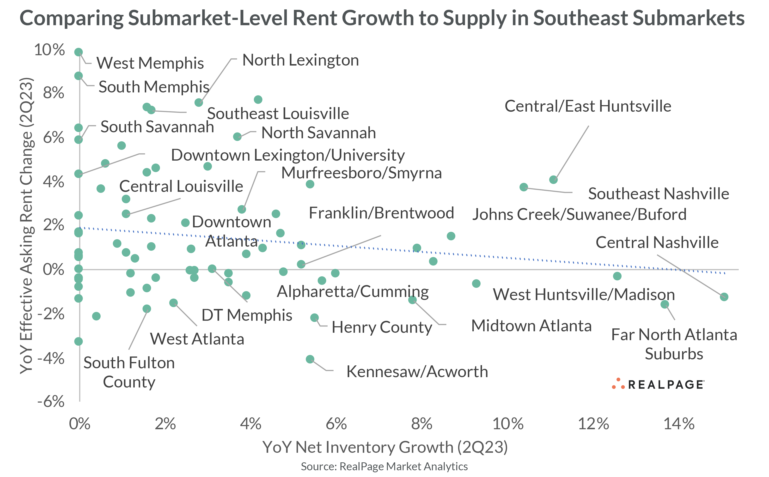 While new apartment supply may not be the only governing factor influencing rent growth across the Southeast submarkets in recent months, it’s clear supply pressure – or lack thereof – does have some impact. Central Nashville is the fastest growing submarket across the Southeast, with the inventory base growing by 15.1% in the year-ending 2nd quarter 2023. This is also one of the Southeast submarkets seeing some of the deepest cuts in effective asking rents, with a decline of 1.3% year-over-year. Other submarkets logging rent cuts amid extreme supply pressure include the Far North Atlanta Suburbs and West Huntsville/Madison. Meanwhile, some submarkets have seen very little to no increase in the existing apartment stock and are logging very strong rent growth. West Memphis is the Southeast region’s top rent growth performer, with an annual hike of 9.8%. This submarket’s inventory base didn’t change at all during the past year. South Memphis also saw solid rent growth without any supply pressure.