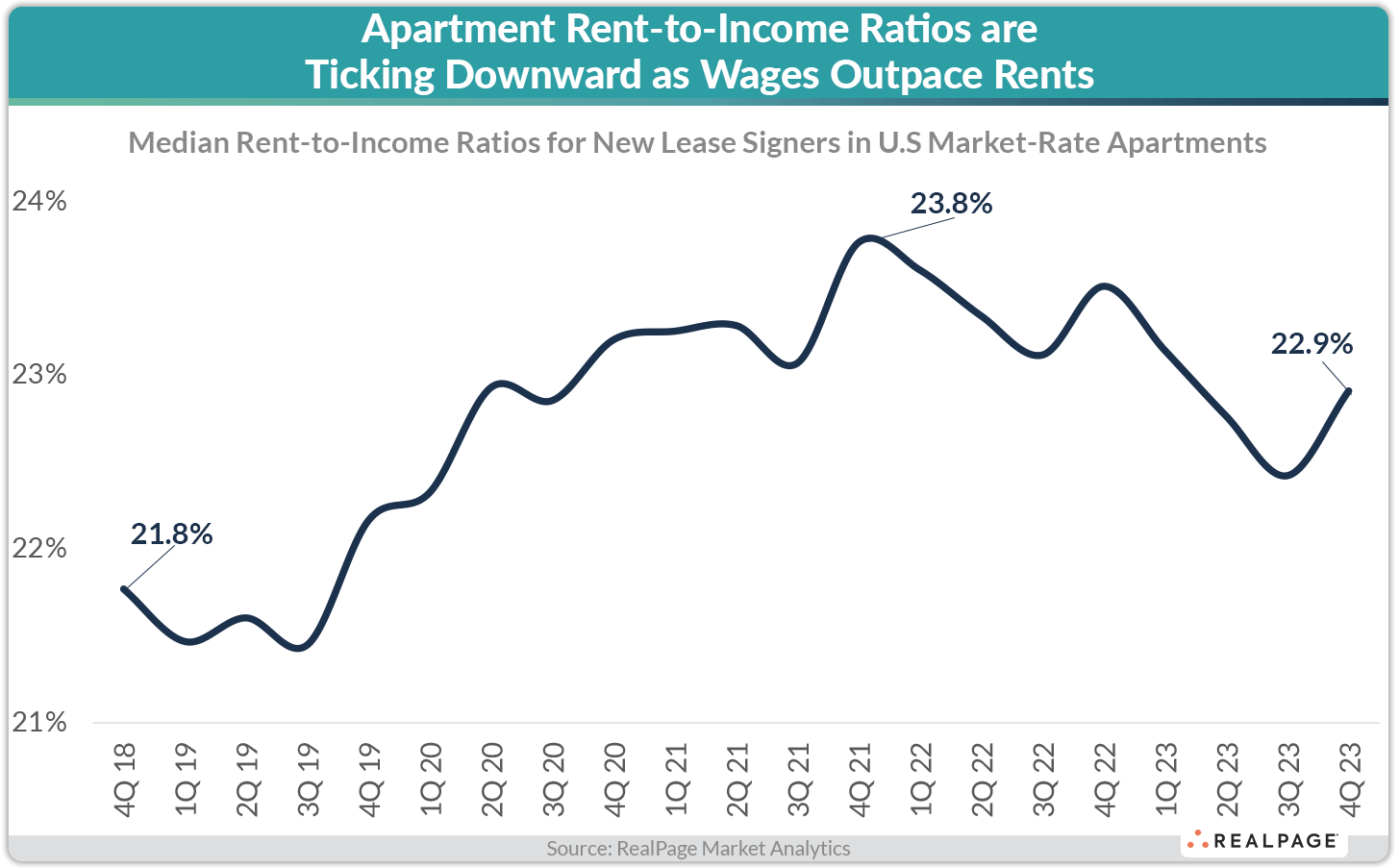 Here's some good news: Apartment rent-to-income ratios declined in 2023 as incomes grew faster than rents. The median U.S. household signing a new lease for a market-rate apartment came in with a rent-to-income ratio of 22.9% in 4th quarter 2023, down 90 basis points (bps) from the peak and down 60 bps year-over-year, according to data from RealPage Market Analytics.
