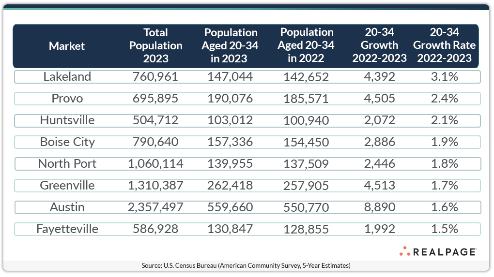 From 2022 to 2023, the U.S. population of 20- to 34-year-olds shrank by roughly 587,000 residents, according to the latest data from the U.S. Census Bureau. That decrease in 20- to 34-year-olds – a key demographic in apartment renter households – amounted to a year-over-year decline of 0.9%, below the 1% increase from 2021 to 2022. In several of the nation’s 150 largest apartment markets, however, the growth rate of young adults in 2023 registered at 1.5% or higher. The small inland Florida market of Lakeland-Winter Haven grew its young adult population 3.1% from 2022 to 2023, accounting for the addition of nearly 4,400 residents. Provo-Orem, UT added over 4,500 young adults, translating to a growth rate of 2.4% year-over-year. Huntsville, AL and Boise, City, ID grew their young adult populations about 2% each from 2022 to 2023. North Port-Sarasota-Bradenton, FL, Greenville/Spartanburg, SC, Austin-Round Rock, TX and Fayetteville-Springdale-Rogers, AR-MO grew their 20- to 34-year-old populations 1.5% to 1.8% year-over-year. However, Austin by far saw the most absolute growth in that cohort among those fastest growing markets, with an increase of nearly 8,900 residents. Helping to keep a healthy dose of young adults in the renter pool, all of these markets are home to a university.