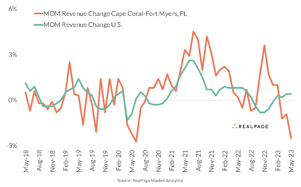 After logging some of the strongest fundamentals nationwide just a couple years ago, the small apartment market of Cape Coral-Fort Myers is now seeing revenues decline. While revenues are still up year-over-year, monthly declines have become a regular pattern since March in this Gulf Coast market with a little over 50,000 units in existing stock. In the month of May, revenues came down by 2.5%, the worst decline among the largest 150 apartment markets nationwide, according to data from RealPage Market Analytics. The recent decline hasn’t been able to completely wipe out previous progress, however, as revenues in Cape Coral/Fort Myers are still up 1.9% on an annual basis, a pace that remains well ahead of the U.S. norm of 0.2%. Driving the most recent decline, effective asking rents were down 1.6% during the month of May, though prices remain at historic highs above $2,000. On the occupancy side of revenues, rates were down 90 basis points in May, taking occupancy to 93.5%. Nearby markets are also seeing decline in monthly revenues. Naples-Immokalee-Marco Island saw the nation’s second worst decrease at 1.9%, while North Port-Sarasota-Bradenton lost 1.1% for the month.