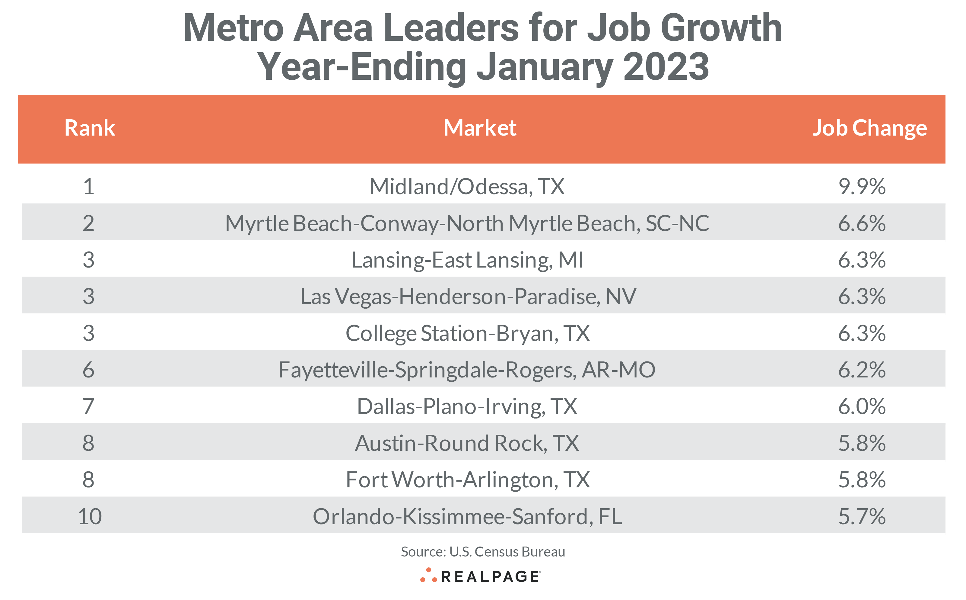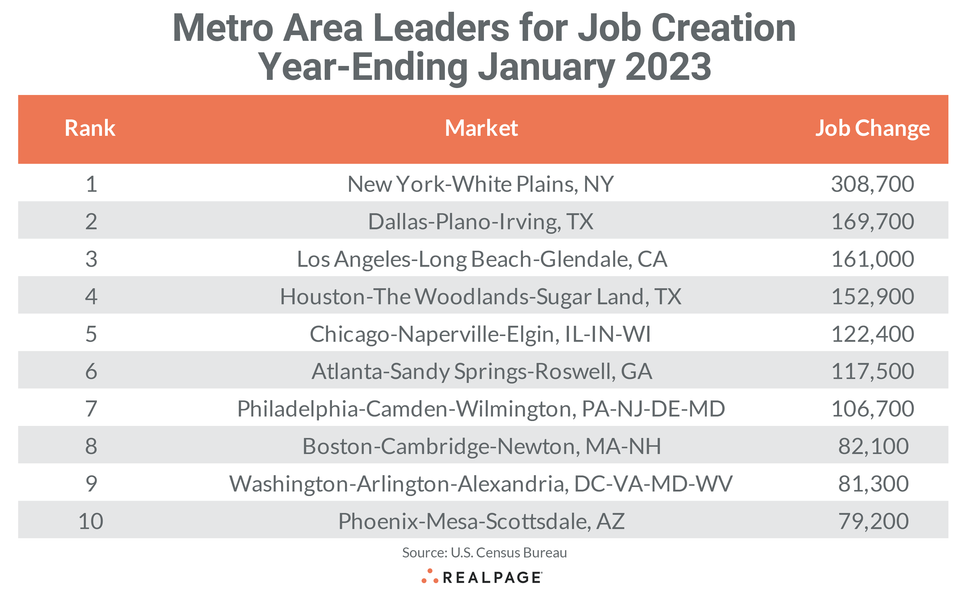 Despite the continuing slowdown from post-pandemic rebounding employment, annual job gains in the top markets in the country continue to be relatively strong. Nationally, employment gains in January and February have exceeded most economists’ expectations but moderation throughout 2023 is still expected.