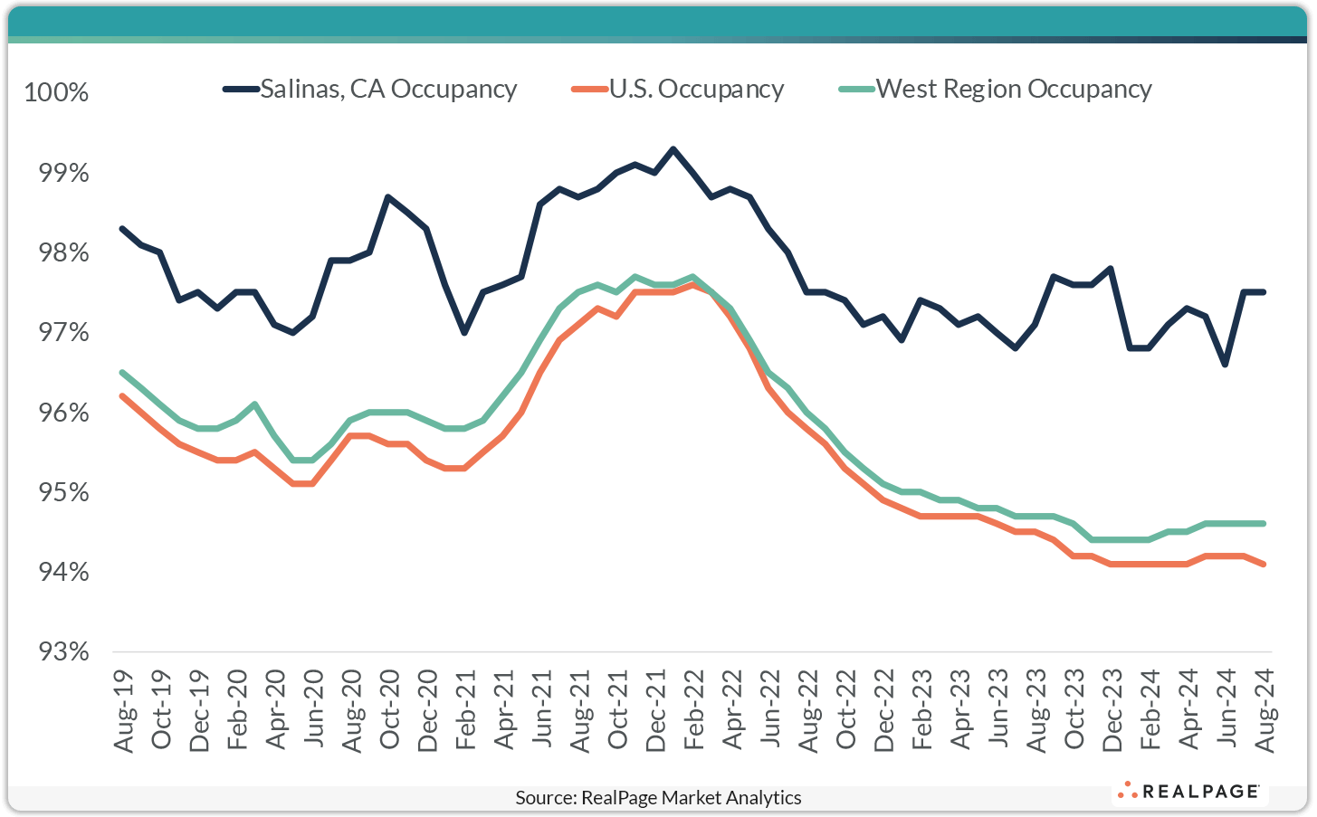 Salinas, CA posted the tightest occupancy in the nation among the 150 largest apartment markets. Salinas’s August reading of 97.5% registered 290 basis points (bps) higher than the West region average and 340 bps above the U.S. norm, according to data from RealPage Market Analytics. In fact, Salinas has consistently registered high occupancy over the past decade, averaging 97.6% since 2014. By comparison, both the West region (95.7%) and the U.S. (95.3%) saw occupancy rates average closer to the effectively full mark over the past 10 years. Located about an hour south of San Jose, the small Salinas market has about 25,000 existing units. It is the seat of government for Monterey County and serves as an important business, governmental and transportation hub for the region. With its proximity to the ocean and temperate climate, Salinas is also a rich and diverse agricultural area with a thriving tourist industry.