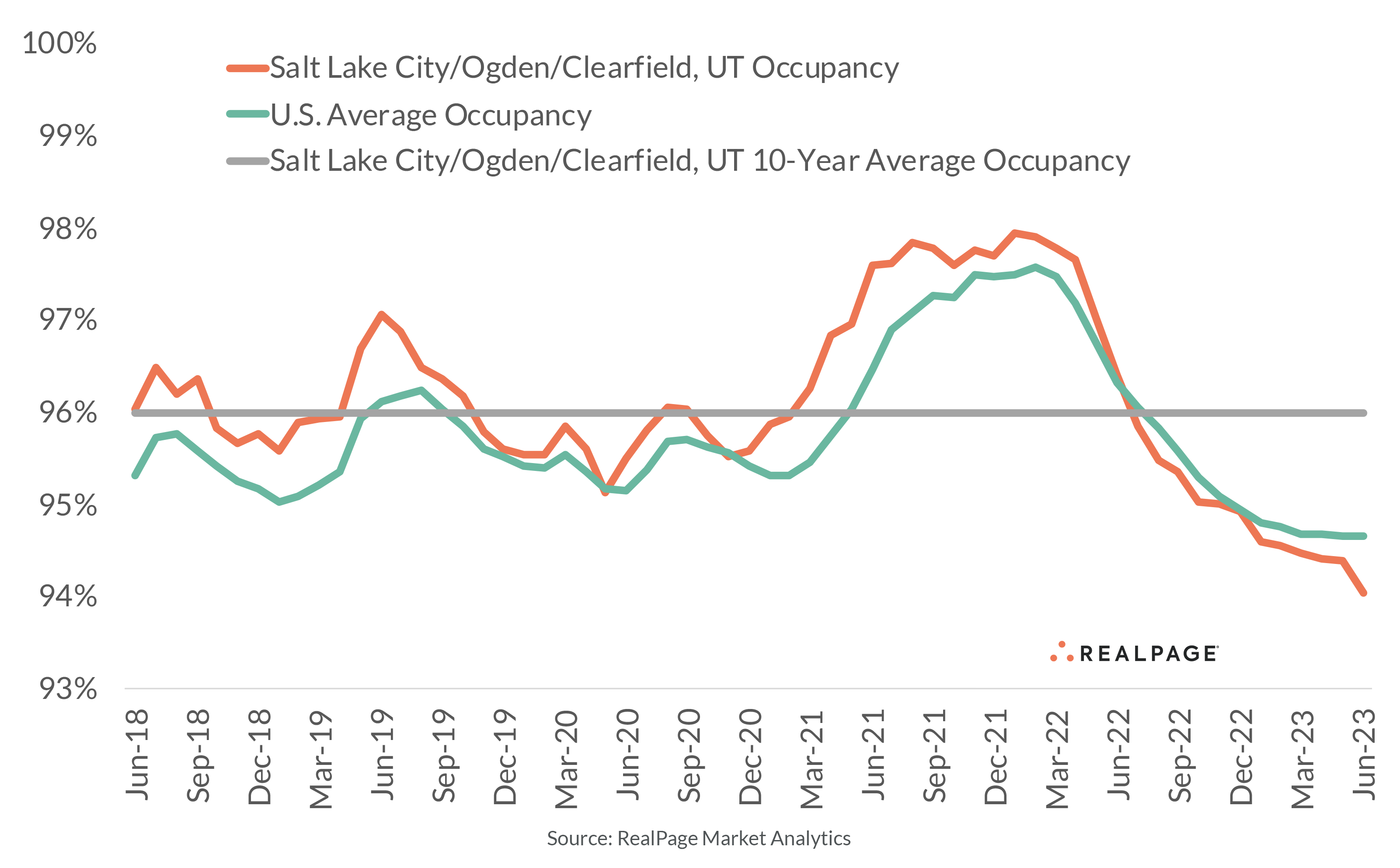 The Salt Lake City/Ogden/Clearfield apartment market has historically been an outperforming market, but fundamentals have faltered in recent months due to mounting supply volumes. Over the past year, occupancy dropped 240 basis points (bps), taking the rate to 94% as of June 2023, according to RealPage Market Analytics. That was the lowest occupancy rate the market has witnessed since June 2010 and registered 70 bps below the national average. For comparison, Salt Lake City’s average occupancy over the past 10 years clocked in at 96%, well above the U.S. average of 95.4% during the same period. As a result of weakened occupancy, apartment operators in Salt Lake City cut rents an average of 1.4% in the year-ending June 2023. Aside from a small dip at the onset of the pandemic, rents in Salt Lake City have not been cut on a year-over-year basis since August 2010. While demand has been solid over the past year, it hasn’t been enough to keep pace with supply. Salt Lake City posted a record-high delivery volume of more than 6,000 units in the year-ending June and completions in the coming year are expected to be more than double that amount (12,400 units). For perspective, Salt Lake City added an average of roughly 3,400 units over the past 10 years and an average of 2,200 units over the past 20 years. Once the supply wave moderates, strong underlying demand drivers will provide a tailwind to performance fundamentals and Salt Lake City should once again return to its outperforming nature.
