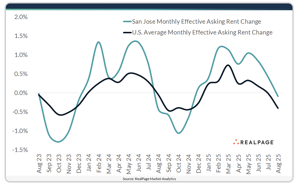 In August, the rent growth streak in San Jose’s apartment market ended, with effective asking rents ticking down 0.1% month-over-month. Rents in San Jose had picked up in each of the previous eight months, with no other large market recording consistent pricing gains during that period. Combined with prior monthly increases, rents in San Jose rose 3.4% in the year-ending August, according to data from RealPage Market Analytics. That gain was quite different from the national average decline of 0.2% and tied with Pittsburgh as the third-largest increase among nation’s 50 largest markets. However, San Jose is prone to big shifts in rents. In fact, San Jose has witnessed some of the most volatile rent change performances among the nation’s 50 largest markets. During the 10 calendar years leading up to the pandemic (2010-2019), annual rent change in San Jose ranged from decline of 2.2% to a hike of 12.2%.