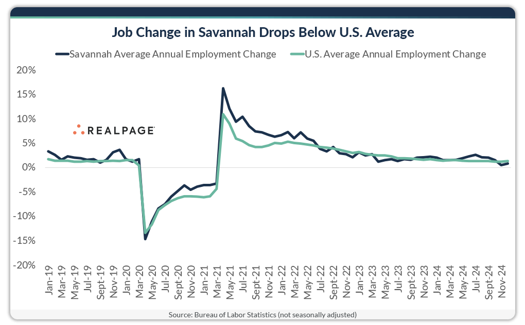 An expanding job base has spurred the local economy to support development. In December 2024, the job base expanded by 0.8% or 1,600 jobs based on preliminary estimates from the Bureau of Labor Statistics. Unemployment in Savannah sat at 2.8% in December, below the U.S. norm (3.8%).