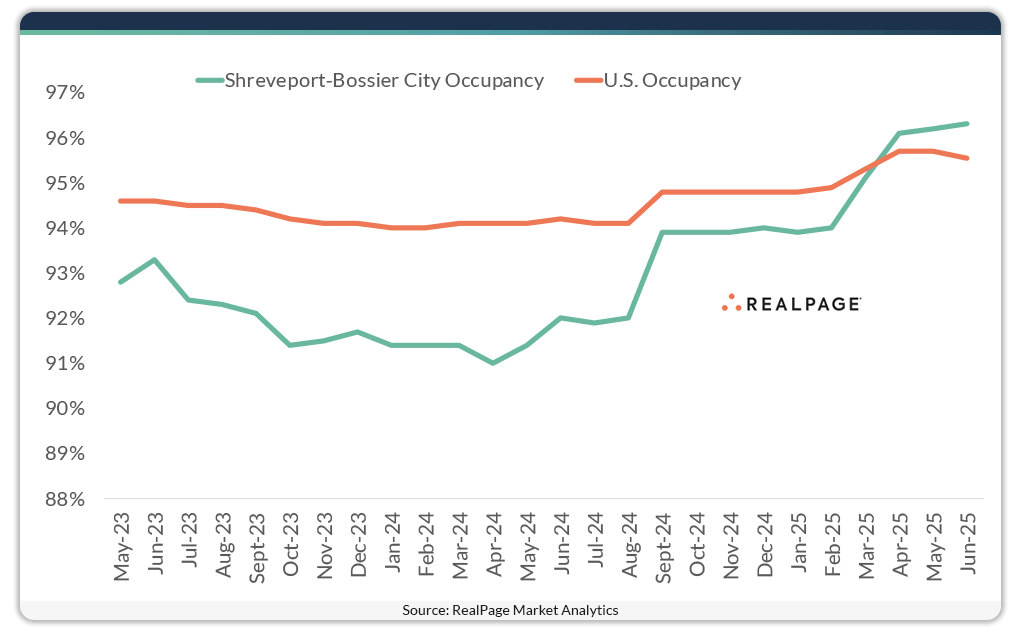 Occupancy in Shreveport tightened to 96.3% in June, marking the third consecutive month occupancy in this small market outpaced the U.S. norm, bucking historical trends. It was also the third consecutive month occupancy surpassed 96% in Shreveport, no small feat for a market where occupancy has trended closer to 93% over the last decade, according to data from RealPage Market Analytics. In fact, Shreveport’s June occupancy ranks as a 39-month high and was 440 basis points above the rate seen just 12 months ago. Strong demand and limited supply in this market known for its riverboat casinos and vibrant music scene has driven recent performance. Existing inventory increased only 3.6% over the last decade in Louisiana’s third most populous city to about 26,200 existing apartment units. Meanwhile, demand reached a 25-year high (1,116 units) in 2nd quarter. With limited vacancies, rents have accelerated, growing 4.8% annually. Still, the average effective asking rent in Shreveport as of June 2025 remained at $1,112 per month, one of the most affordable across the top 150 markets.