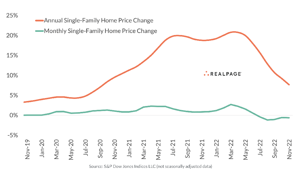 Home price increases are continuing to trend down as housing demand falls amid rising mortgage rates. The annual rate of acceleration has slowed over the past seven months and is now at the lowest level since September 2020. Still, home prices continue to increase at a robust clip on a year-over-year basis. Home prices fell 0.6% from October to November, according to the S&P CoreLogic Case-Shiller U.S. National Home Price Index, which measures average home prices across the nation. That was the fifth straight month-over-month decline. On an annual basis, home prices were still up 7.7% in November, down from the 9.2% annual jump in October and well below the all-time highs of 20.8% in March and April. This pattern of deceleration was apparent at a regional level. The S&P CoreLogic Case-Shiller 20-City Composite Index posted a 6.8% annual gain in November, down from 8.6% the previous month. All 20 cities in the index reported price declines in November 2022 compared to October 2022. Some of the biggest month-to-month declines occurred in the West region of the country, with the steepest declines occurring in Las Vegas (-1.8%), San Francisco (-1.7%) and Phoenix (-1.6%). On an annual basis, all 20 cities recorded decelerating prices, with the smallest changes in the West region. San Francisco (-1.6%) was the first city to record a year-over-year decline in home prices, followed by very small gains in Seattle (1.5%), Portland (3.9%) and Los Angeles (4.4%). The Southeast region, on the other hand, posted some of the nation’s biggest hikes, led by Miami (18.4%), Tampa (16.9%) and Atlanta (12.7%).