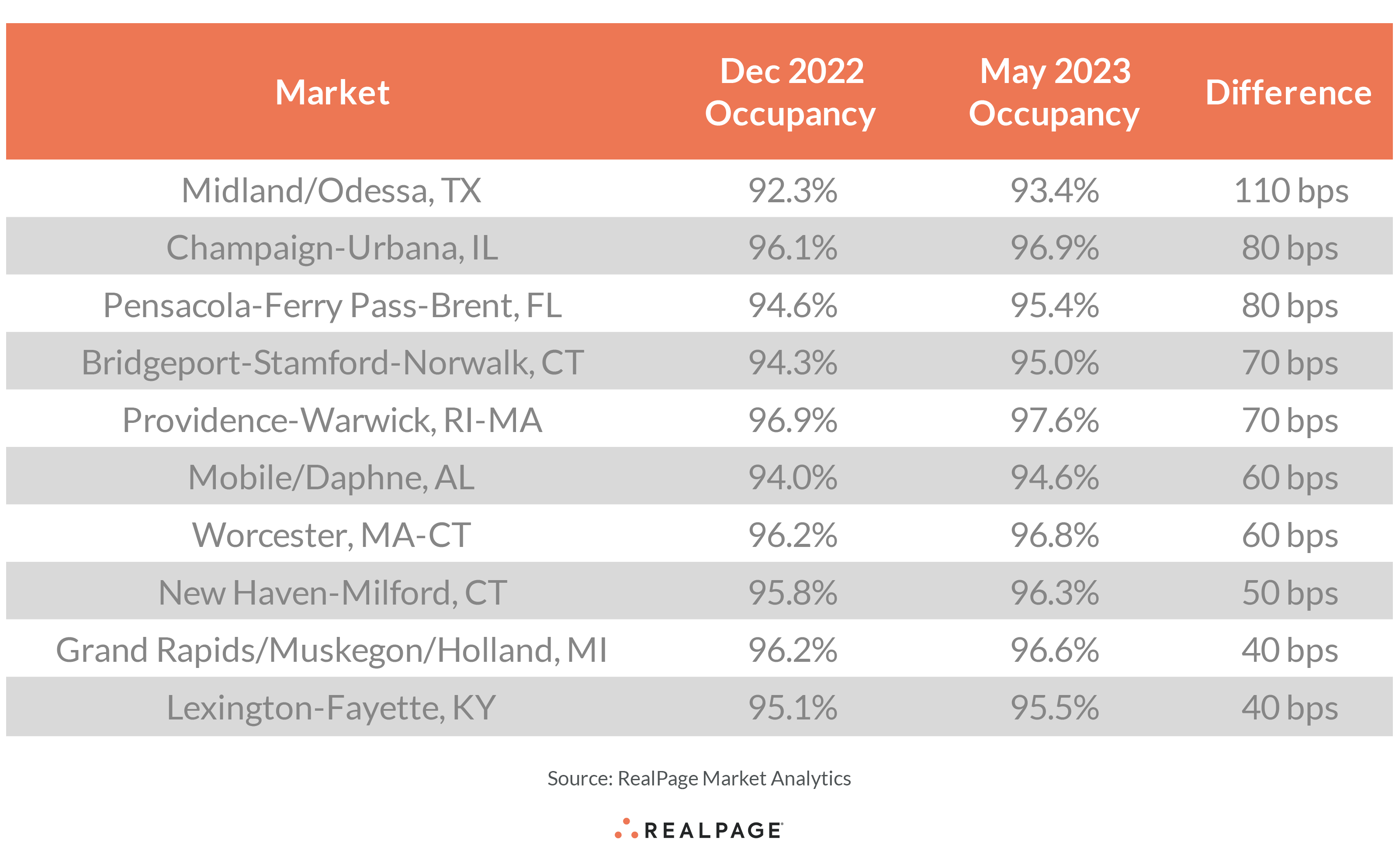 Despite a year-to-date national decline of 20 basis points (bps), a handful of small apartment markets have logged notable occupancy growth thus far in calendar 2023. The standout performer in this group was Midland/Odessa, TX, where just a few years ago, occupancy was below the 90% mark, according to data from RealPage Market Analytics. By the end of 2022, occupancy had worked its way up to 92.3% and since then, the rate has climbed another 110 basis points. This was a staggering performance compared to what was seen across much of the nation. In fact, the U.S. overall suffered an average occupancy decline of 20 bps in the first five months of calendar 2023. Recent occupancy increases in Midland/Odessa have helped the market become a nationwide leader in revenue growth in the past year. However, annual occupancy growth in this market was better at 140 bps, meaning that the pace of increase has actually slowed in the Texas oil-dependent market. Every other market with occupancy growth thus far in calendar 2023 logged an annual decline as of May. In other words, while occupancy is down since May 2022 in those markets, the story actually started looking more positive in recent months. The biggest turnarounds occurred in Pensacola-Ferry Pass-Brent, FL and Mobile/Daphne, AL. These southeast coastal markets saw notable decline in the back half of 2022, but the bloodletting has eased and occupancy in both these areas is now well ahead of December 2022 rates.