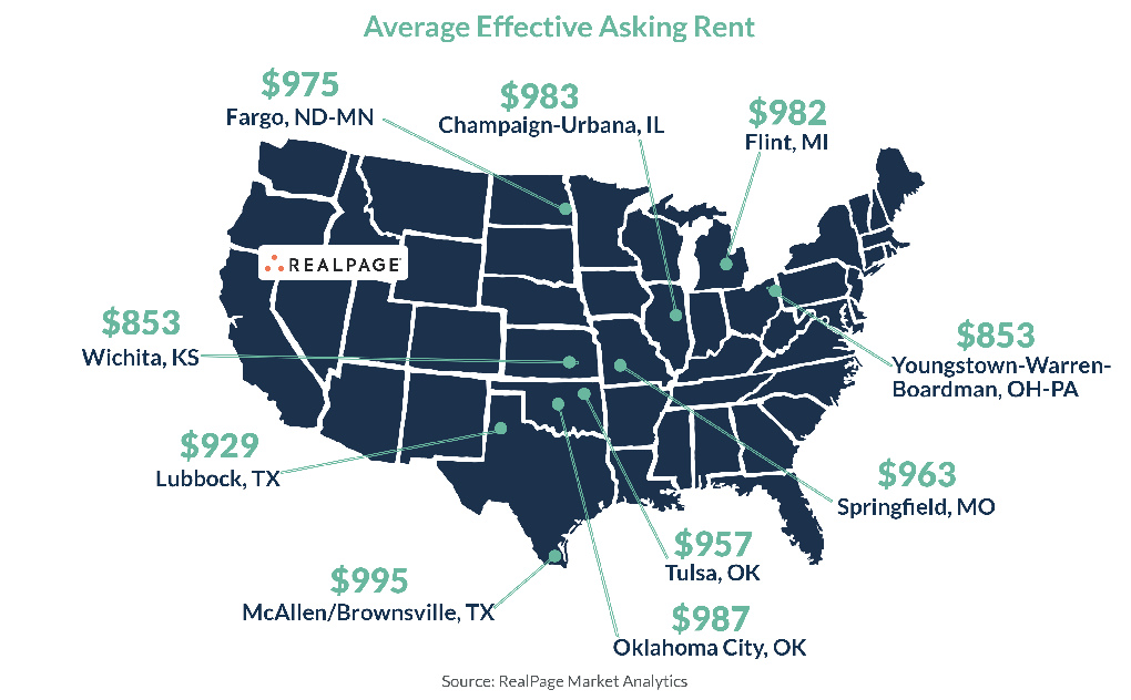 After a few years of elevated rent growth, average monthly asking rents for the largest 150 apartment markets across the U.S. is $1,809. Prices are now as high as $3,000 to $4,000 in New York and the Bay Area, according to May data from RealPage Market Analytics. In fact, rates are up pretty much across the board, with all but 10 small markets logging rents above the $1,000 mark. Among the markets with rates still below $1,000, all are located in the Midwest or the South regions. Youngstown-Warren-Boardman, OH-PA and Wichita, KS are tied for lowest average rents in the nation, with prices at just $853. Markets with rents between $930 and $960 include Lubbock, TX, Tulsa, OK and Springfield, MO. Of note, Springfield, MO is the smallest of these markets, with an existing apartment count just shy of 25,000 units. Logging prices between $975 and $1,000 were Fargo, ND-MN, Flint, MI, Champaign-Urbana, IL, Oklahoma City, OK and McAllen/Brownsville, TX. Oklahoma City was the only one of these markets with an existing apartment count of more than 100,000 units.