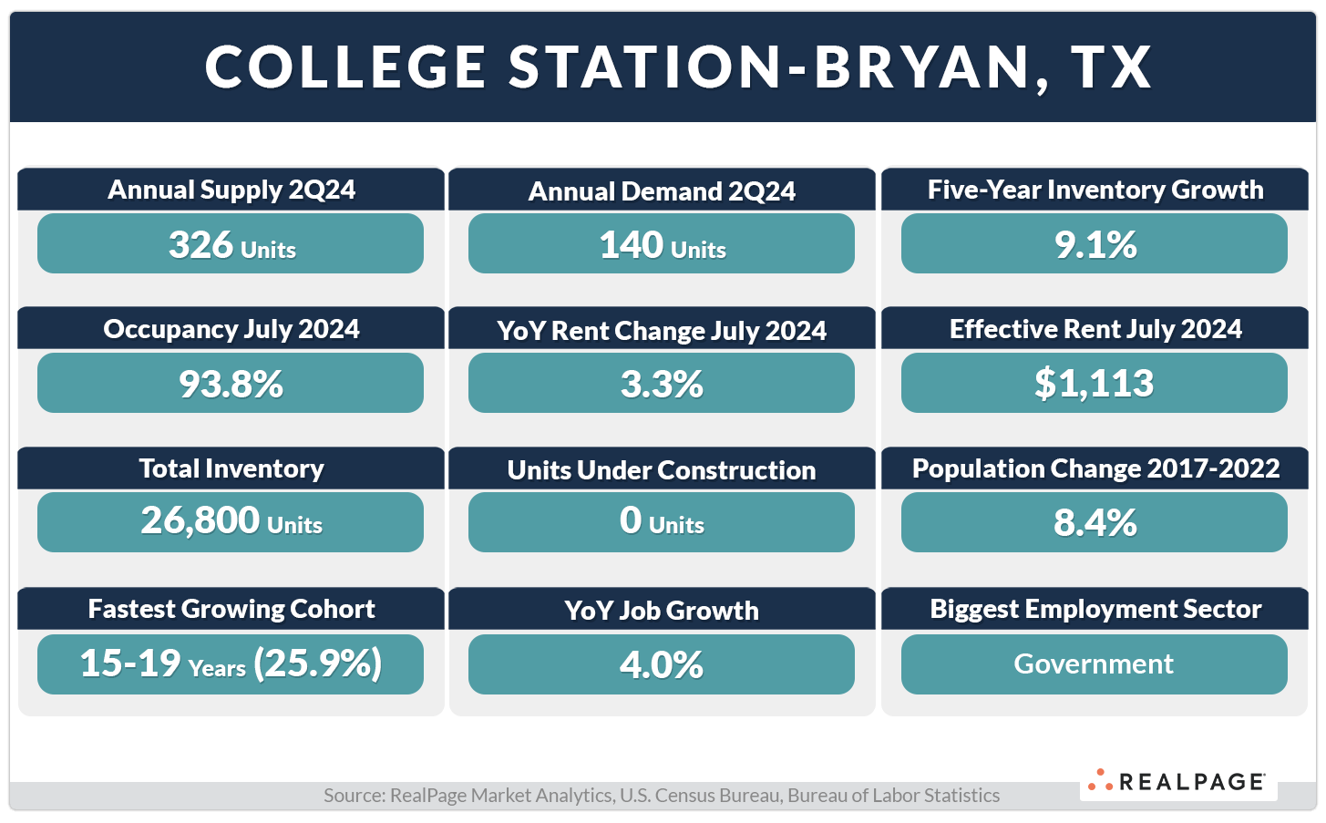 Lubbock is also arguably the biggest market in west Texas, making it a hub for everything from health care to services and retail for nearby rural communities, which further stabilizes its jobs economy. A relatively mild volume of units were underway in Lubbock as of 2nd quarter 2024, but that comes on top of a 8% total inventory growth rate in the last five years.