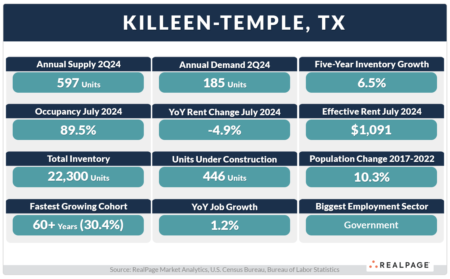 Killeen-Temple is located in the middle of two other fast-growing Texas markets: Waco to the north and Austin to the south. It also encompasses Fort Cavazos (formerly Fort Hood), which is the largest U.S. military instillation in the world at about 340 square miles, with over 34,000 active-duty military (plus another 13,000 civilians and contractors). That easily makes Government jobs the largest employment sector in Killeen-Temple.