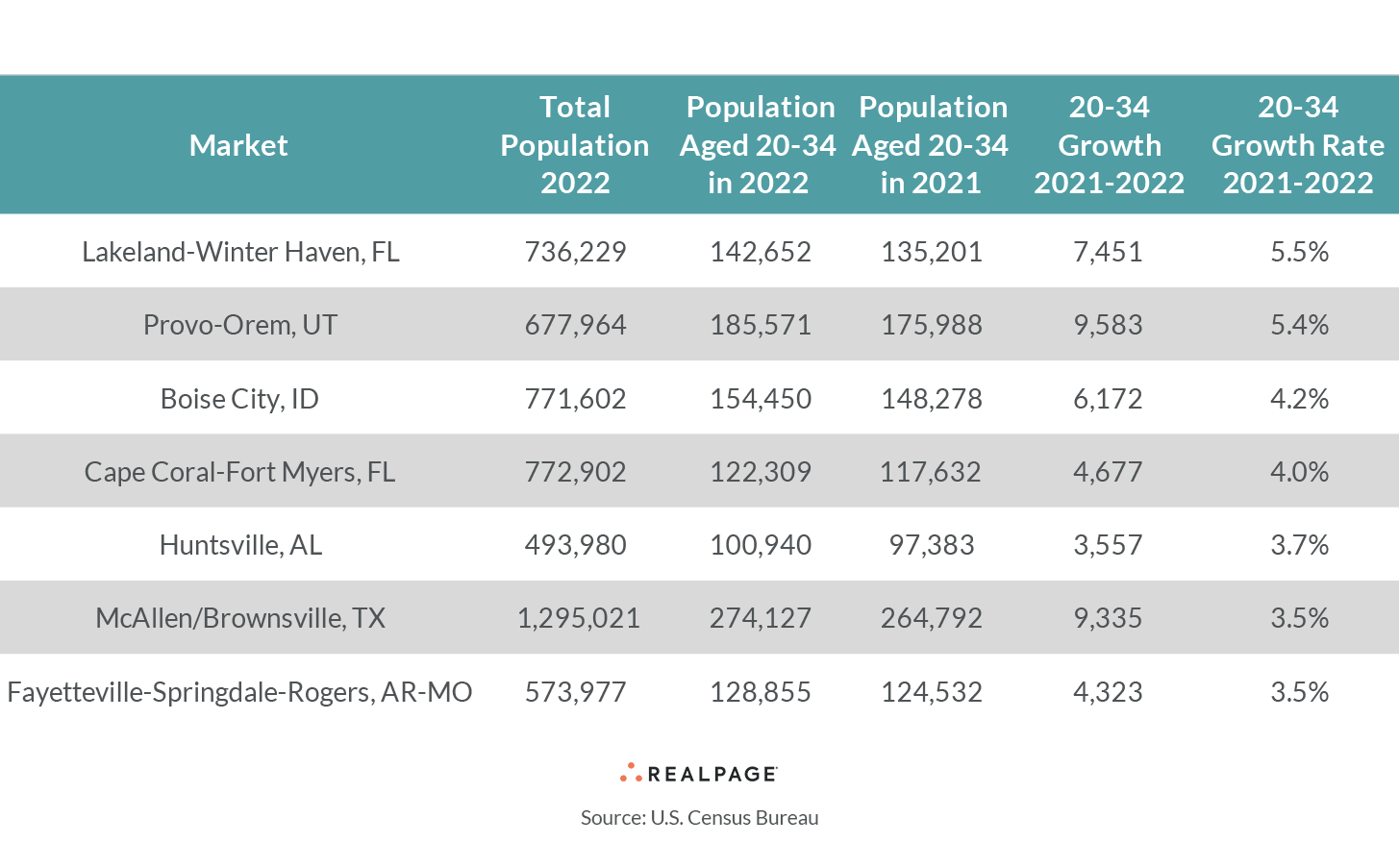 From 2021 to 2022, the age of 20-34-year-olds grew by nearly 700,000 residents, according to the latest data from the U.S. Census Bureau. That surge in 20-34-year-olds – a key demographic in apartment renter households – accounted for a 1% increase year-over-year. In several small markets, however, the growth rate of young adults surged well beyond the national norm. The small inland Florida market of Lakeland grew its young adult population 5.5% from 2021 to 2022, accounting for the addition of 7,500 residents. Provo-Orem, UT added over 9,500 young adults, translating to a growth rate of 5.4% year-over-year. Boise, City, ID and Cape Coral-Fort Myers, FL grew their young adult population about 4% each from 2021 to 2022. Huntsville, AL; McAllen/Brownsville, TX; and Fayetteville-Springdale-Rogers, AR-MO all grew their 20-34-year-old population about 3.5% year-over-year. Several of these markets – Provo/Orem, Boise, Huntsville and Fayetteville – are home to a major state university, often keeping a healthy dose of young adults in the renter pool in those areas.