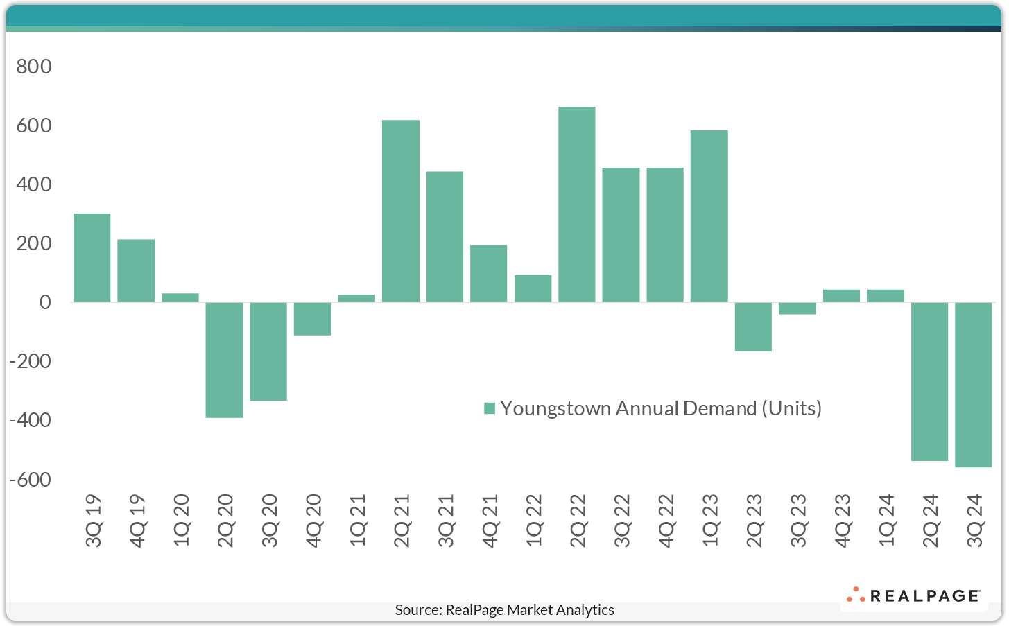 A small town on the Ohio/Pennsylvania border lost more demand in the past year than any of the nation’s largest 150 apartment markets. The net move-outs from nearly 560 units in Youngstown in the year-ending 3rd quarter was also the market’s worst showing in nearly a decade. This recent performance made Youngstown one of only nine apartment markets among the nation’s top 150 to see net move-outs in the past year, according to data from RealPage Market Analytics. New apartment supply has been absent in Youngstown since 2019 and not long ago, Youngstown was the nation’s occupancy leader. While occupancy here is still tight and well ahead of national norms, the rate has come down a bit since the 2022 peak. Inspiring the weak demand, Youngstown recorded one of the nation’s worst job loss rates in the past year. The market lost 700 jobs in the year-ending October, translating to a 0.3% job base contraction, according to the Bureau of Labor Statistics. This market also lost some population according to the latest Census Bureau data, with the resident base contracting 0.2% between 2022 and 2023.