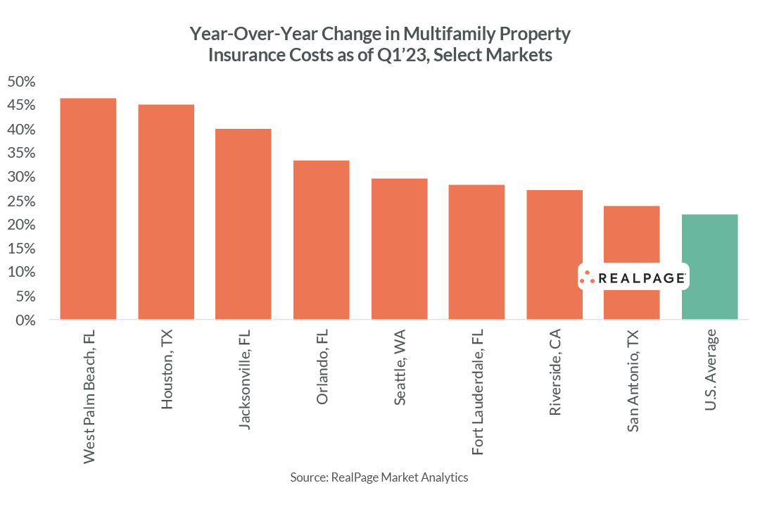 Annualized average insurance premiums for U.S multifamily properties skyrocketed 22% year-over-year through 1st quarter 2023, according to RealPage data. That comes on top of a similarly large increase in the preceding year.