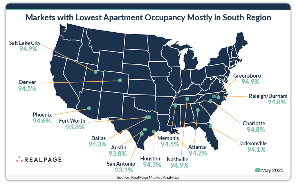 Although the South region occupancy rate in May ticked above the region’s pre-pandemic five-year average (94.5%), about 80% of South region markets lagged the national norm contributing to the region’s underperformance, according to data from RealPage Market Analytics.