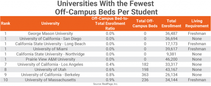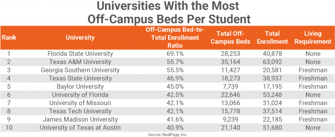Of the RealPage 175, the schools that rank in the top 10 all have at least two off-campus beds per every five students.